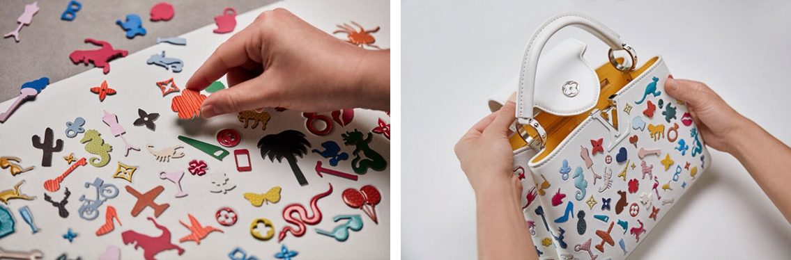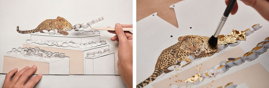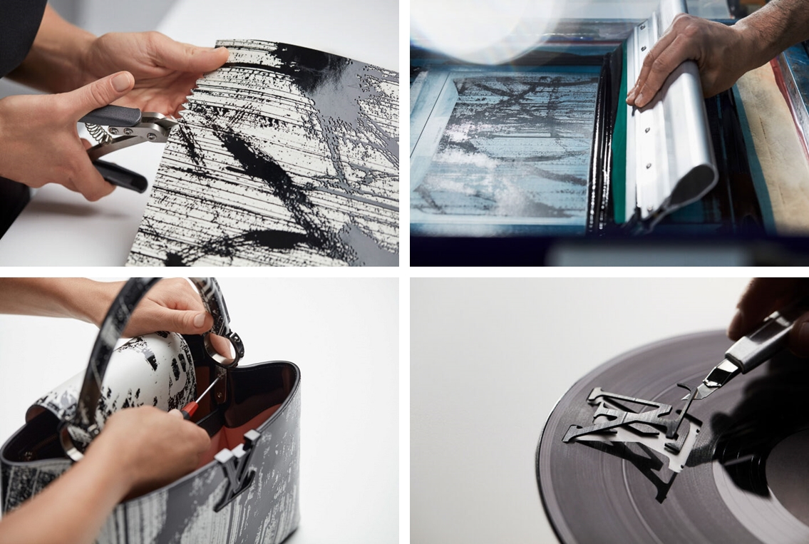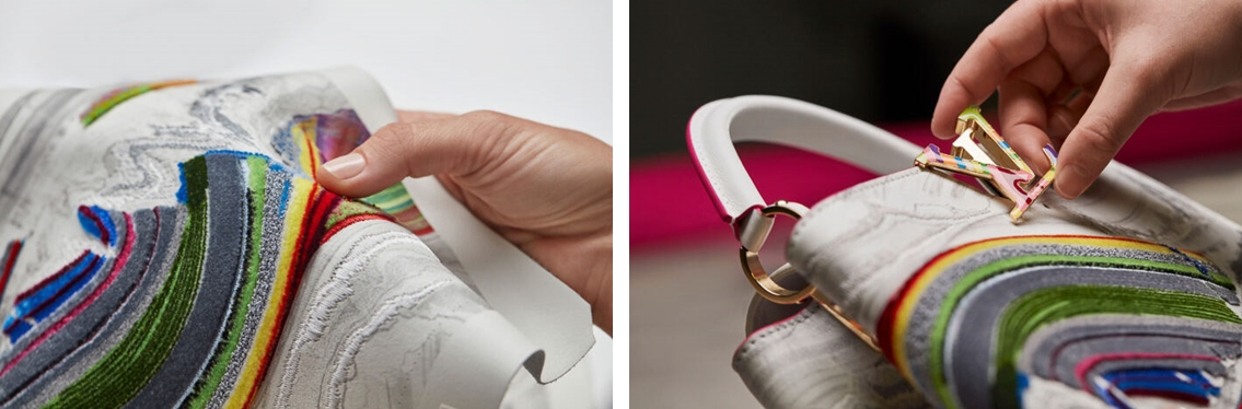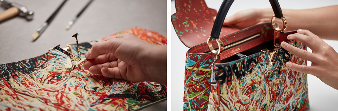 Trải qua một quá trình phức tạp được thực hiện thủ công bởi các nghệ nhân của Louis Vuitton: đầu tiên là in 3D lên bề mặt da trắng, sau đó vận dụng ba kỹ thuật thêu thủ công phức tạp và cuối cùng là thực hiện vẽ tay trên những chi tiết thêu, đã tạo ra hiệu ứng phân lớp tựa như các nét cọ của nữ họa sỹ và chiều sâu cho bề mặt tác phẩm.