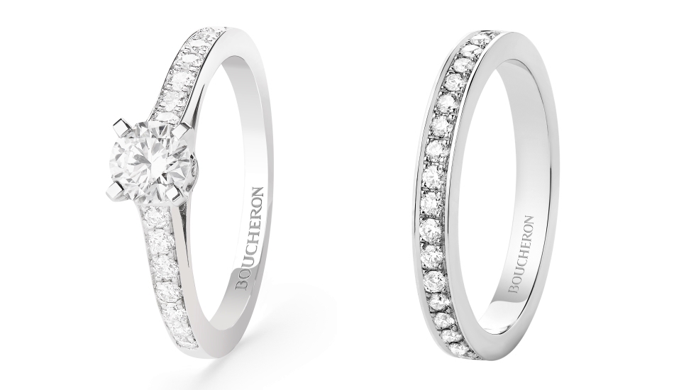Chiếm trọn ánh nhìn khi chạm mắt là mẫu nhẫn cưới và nhẫn cầu hôn bằng bạch kim nạm kim cương. Hoàn hảo trên cổ tay nàng là mẫu lắc đeo tay 3 vòng Jack de Boucheron bằng vàng trắng nạm kim cương sành điệu.