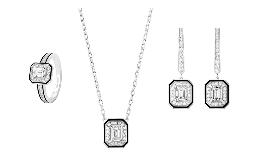 Nổi bật nhất là phiên bản dành cho nam, nạm những viên kim cương được cắt dạng emerald 0,60 carat, hòa hợp với viên kim cương tròn nổi bật trên viền sơn mài đen như sứ. Đồng điệu là mẫu nhẫn Vendôme Liseré dành cho nữ nổi bật bởi viên kim cương lớn cắt dạng emerald 0,5 carat xung quanh được tô điểm bằng kim cương tròn, trên nền chất liệu vàng trắng với viền sơn mài đen. Hoàn thiện bộ trang sức là dây chuyền, lắc tay nạm kim cương cực kỳ tinh xảo.