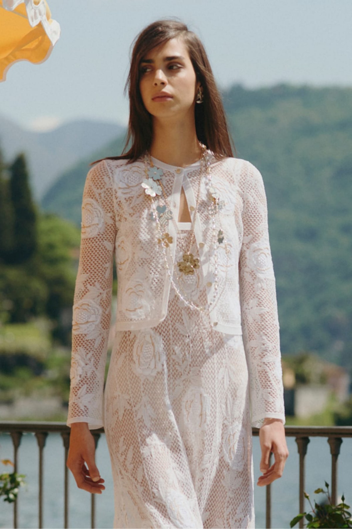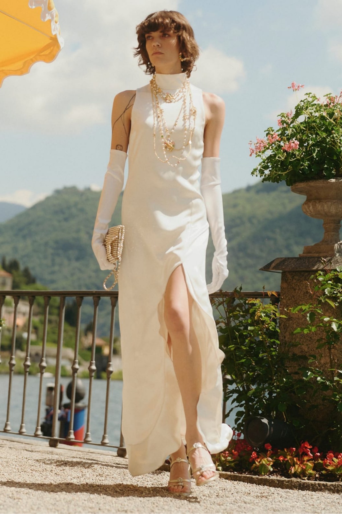 Tinh thần bộ sưu tập vẫn hiện diện qua các chất liệu tweed lấp lánh, taffeta và satin uyển chuyển. Đặc biệt hơn, những chiếc khăn lụa satin từ kho lưu trữ Mantero – nhà dệt lụa Ý danh tiếng từ năm 1902 – xuất hiện như những nàng thơ bước ra từ thi ca và lịch sử. Chúng được quấn quanh tóc, vòng qua cổ hay điểm xuyết trên cổ tay, cổ chân; vừa là phụ kiện vừa là nhịp cầu nối giữa kỹ nghệ thủ công và cảm xúc couture, đồng thời gợi nhớ ký ức về những chiều hoàng hôn bên hồ Como rực rỡ.