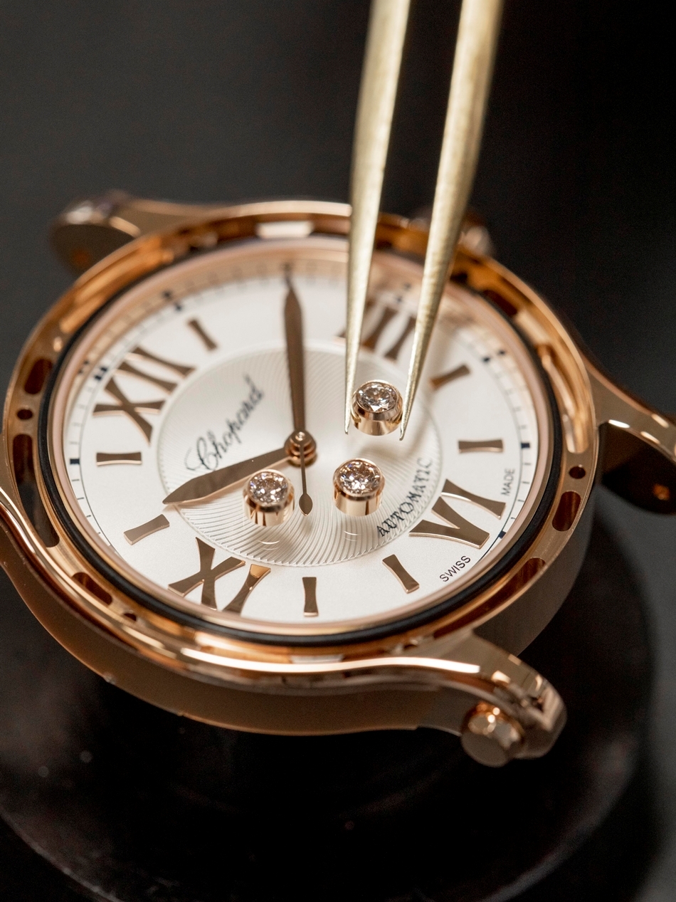 Lorena là nghệ nhân đã thực hiện điều này trong 8 năm qua (hoặc như Chopard gọi bằng danh xưng “nhà biên đạo múa của kim cương”). Trên thực tế, những viên kim cương được bao bọc giữa hai tinh thể sapphire sau đó được niêm phong thủ công bằng một giá đỡ. Điều quan trọng là phải xử lý áp suất phù hợp để duy trì khả năng chống nước, đồng thời tạo không gian rộng rãi cho các “đế” kim cương tự do di chuyển và không bị lật.
