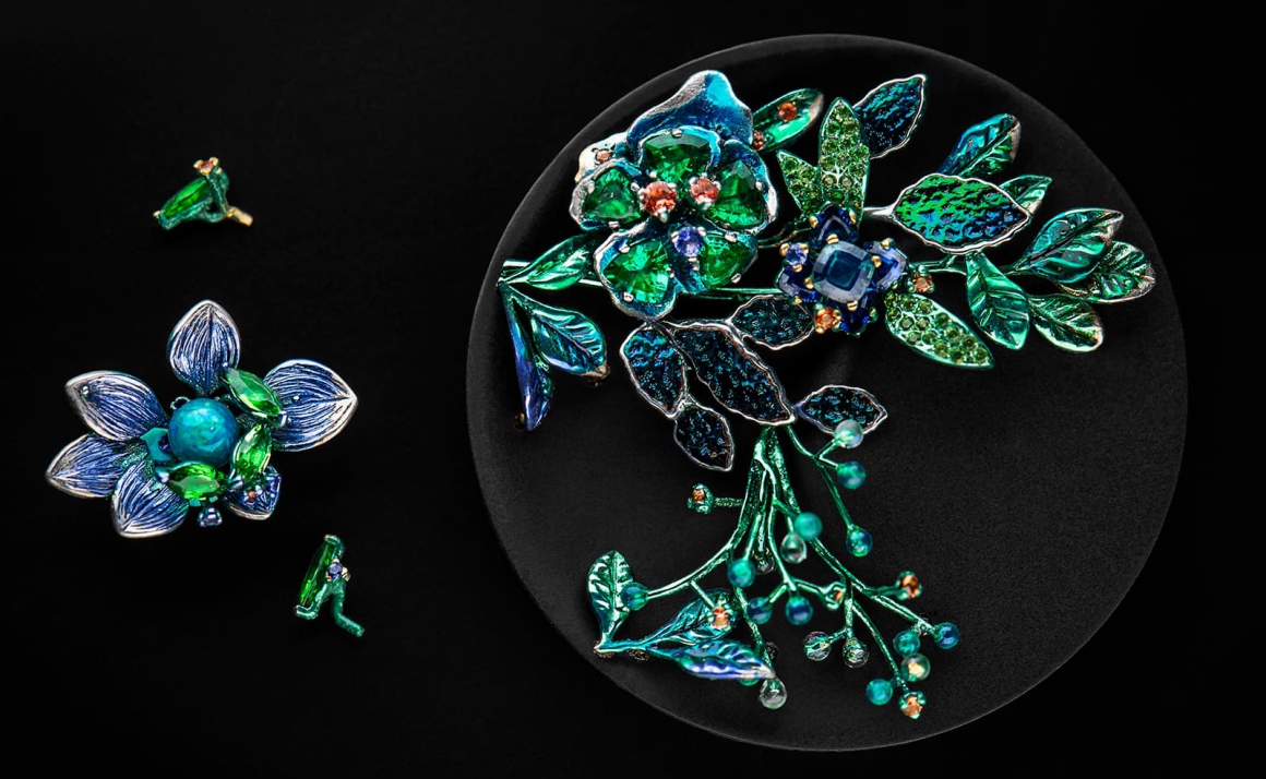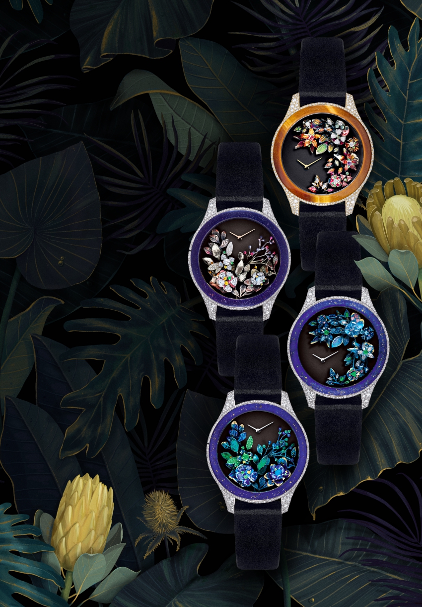Bốn tân phẩm là bốn khu vườn cùng những đóa hoa yêu kiều, điểm xuyến bằng viền lắp kính chạm khắc từ đá quý, nâng tầm hoàn thiện bởi lớp vỏ bằng kim cương – tất cả làm nên vũ khúc ánh sáng lấp lánh ở chốn tiên cảnh từ hừng đông đến tận khi màn đêm buông xuống.