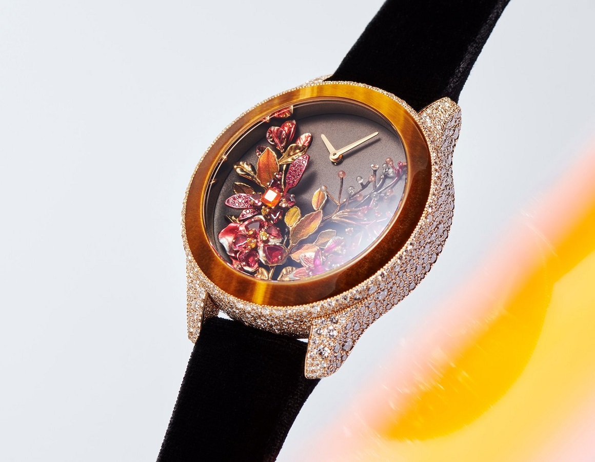 ào lúc nửa đêm, ánh trăng chiếu rọi xuyên qua những cành cây, phản chiếu lên những tán lá sắc màu huyền ảo. Sự lộng lẫy của các loại đá quý như ngọc lục bảo, ngọc hồng lựu, ngọc bích, đá mắt hổ, kim cương… hòa cùng sắc vàng kiêu sa đã làm nên một khu vườn thần tiên ngự trên mỗi mặt số của bộ sưu tập Grand Soir Jardins De Nuit.