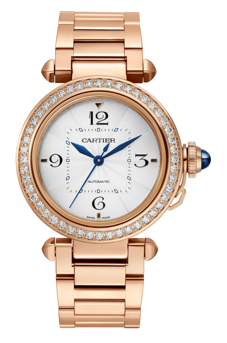 Nổi bật giữa vô vàn thiết kế thuộc bộ sưu tập Pasha De Cartier 2020, chiếc đồng hồ này kiêu hãnh khoe bộ vỏ vàng hồng 35mm và gờ kính rực rỡ 48 viên kim cương nhiều mặt. Họa tiết chạm lộng hình vuông kiểu đường ray trên mặt số, bổ sung sự tương phản thú vị cho thiết kế tổng thể. Bên cạnh đó, 4 số Ả Rập khác biệt và kim hình kiếm góp phần kiến tạo ngoại diện siêu hiện đại. Việc điều chỉnh kích thước của dây đeo kim loại đến mắt xích gần nhất được bổ sung vào công nghệ nổi bật trên đây.