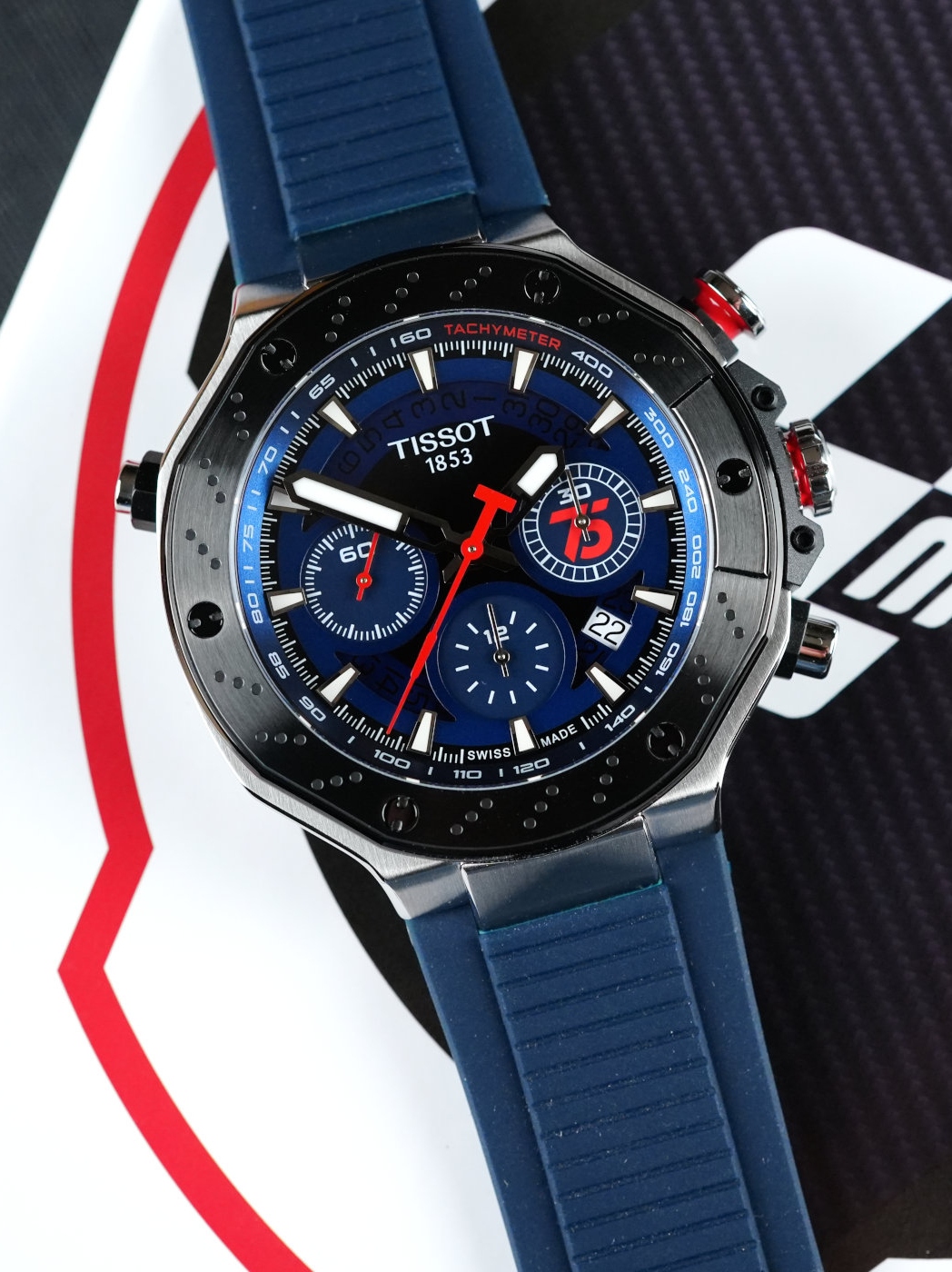Tissot – đối tác lâu năm của MotoGPTM trong suốt 25 năm qua vừa bổ sung vào bộ sưu tập T-Race 4 mẫu đồng hồ mới: 2 phiên bản đặc biệt nhằm kỉ niệm 75 năm thành lập giải đua MotoGPTM và 2 phiên bản T- Race Chronograph Quartz. Các tạo phẩm là sự kết hợp của những chi tiết và chuyên môn của ngành chế tạo đồng hồ, cơ khí xe máy và phong cách sống tự do, phóng khoáng của những ai đam mê bộ môn thể thao đua xe.
