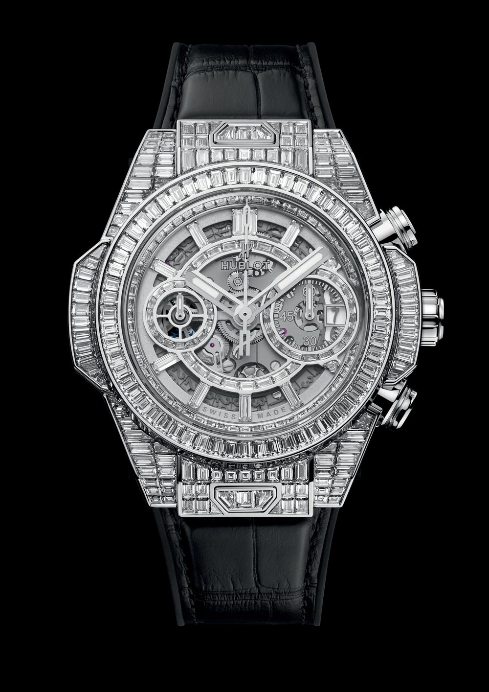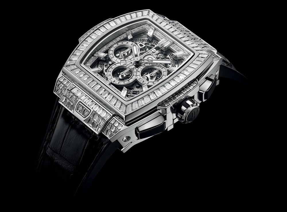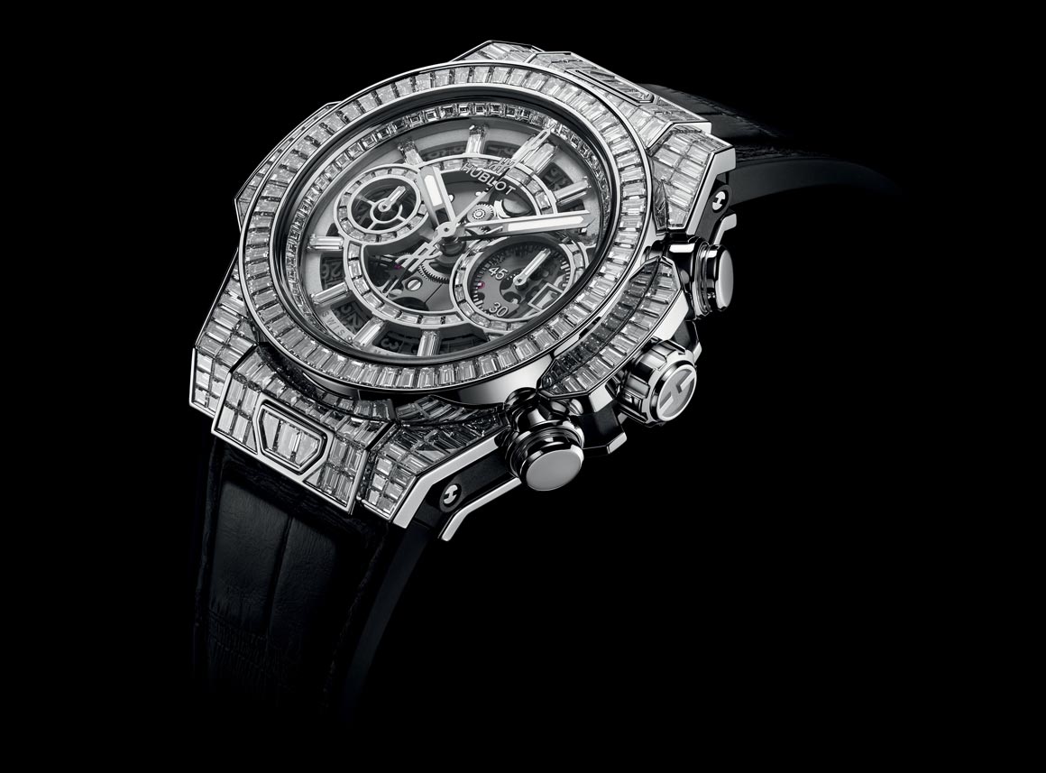 Được sắp xếp thành các hàng gần nhau trong không gian khép kín vô hình trên nền vàng trắng 18K, 243 viên kim cương (8,6 carat) tô điểm vỏ và gờ kính 42mm, trong khi 61 viên (1,3 carat) mang đến vẻ sang trọng đương đại cho mặt số của cỗ máy bấm giờ quét ngược mới nhất. Trái tim đang đập của tuyệt phẩm là Calibre HUB1280, bộ máy Unico 2 có kiến trúc và cải tiến hoàn toàn mới bao gồm bộ ly hợp thứ hai dao động và hệ thống ma sát chronograph ổ bi có thể điều chỉnh. Kỳ quan công nghệ này với bốn đơn xin cấp bằng sáng chế đang chờ duyệt, sóng đôi cùng dây đeo cá sấu có khóa cài nạm 30 viên kim cương (2,6 carat).