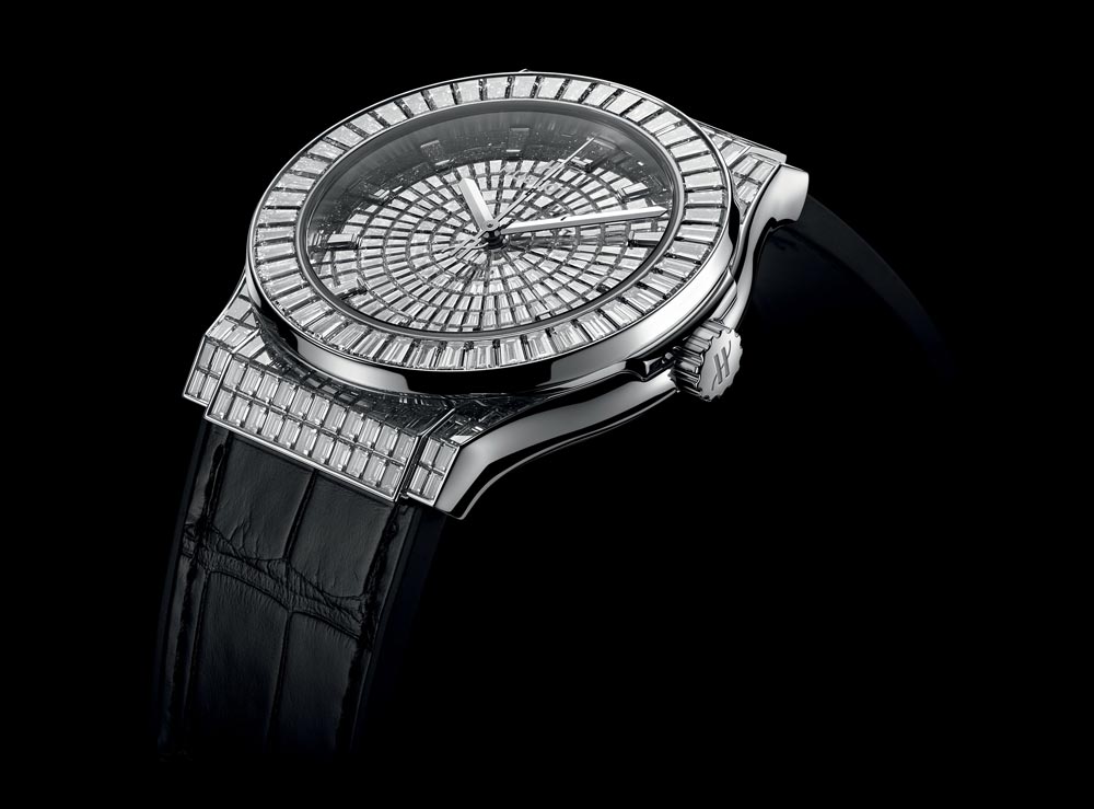 Với giới mộ điệu, Hublot HUB4700 là một trong những cỗ máy bấm giờ Thụy Sỹ tốt nhất từng được tạo ra. Thiết kế của nó lấy cảm hứng trực tiếp từ Big Bang, một cấu trúc vỏ máy độc đáo cho phép kết hợp vô hạn các vật liệu. Trong phiên bản High Jewellery, 178 viên kim cương (8,1 carat) tô điểm cho vỏ tonneau, trong khi 113 viên khác (2,1 carat) nằm xung quanh rìa của các chỉ số và đĩa phút ở vị trí 3 giờ, đĩa giờ ở vị trí 6 giờ cùng đĩa thứ hai ở vị trí 9 giờ. Dây đeo thanh lịch bằng da cá sấu khâu trên cao su tự nhiên gắn khóa cài nạm 55 viên kim cương baguette (2,9 carat), hoàn thiện tác phẩm quý giá này.