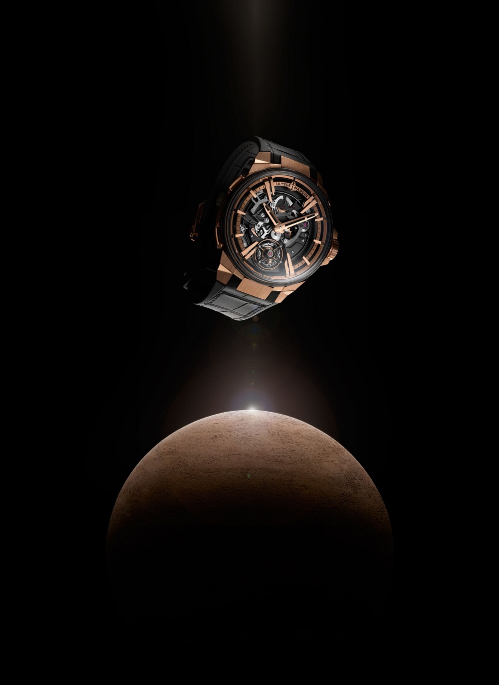 Perpetual Moon Obsidian khoác vỏ vàng hồng 42mm đã biểu diễn một trong những khung cảnh mặt trăng ngoạn mục nhất trong lãnh địa đồng hồ. Bên dưới mặt số obsidian được khai thác ở Trung Mỹ từ thời xa xưa và đặc biệt được sử dụng trong các nghi lễ tôn giáo của các nền văn minh tiền Colombia là bộ máy lên dây bằng tay A & S1512 cung cấp hiển thị tuần trăng kép hoạt động vô cùng chính xác. Ở mặt số, một đĩa mặt trăng lớn được trình bày trong một cửa sổ hào phóng với đường cắt tròn cho phép chiêm ngưỡng các thay đổi của mặt trăng. Để hoàn thiện sự giao thoa tương phản giữa các tông màu nóng và lạnh này, thương hiệu đã chọn dây đeo bằng da cá sấu màu xanh lam khâu chỉ bạc.