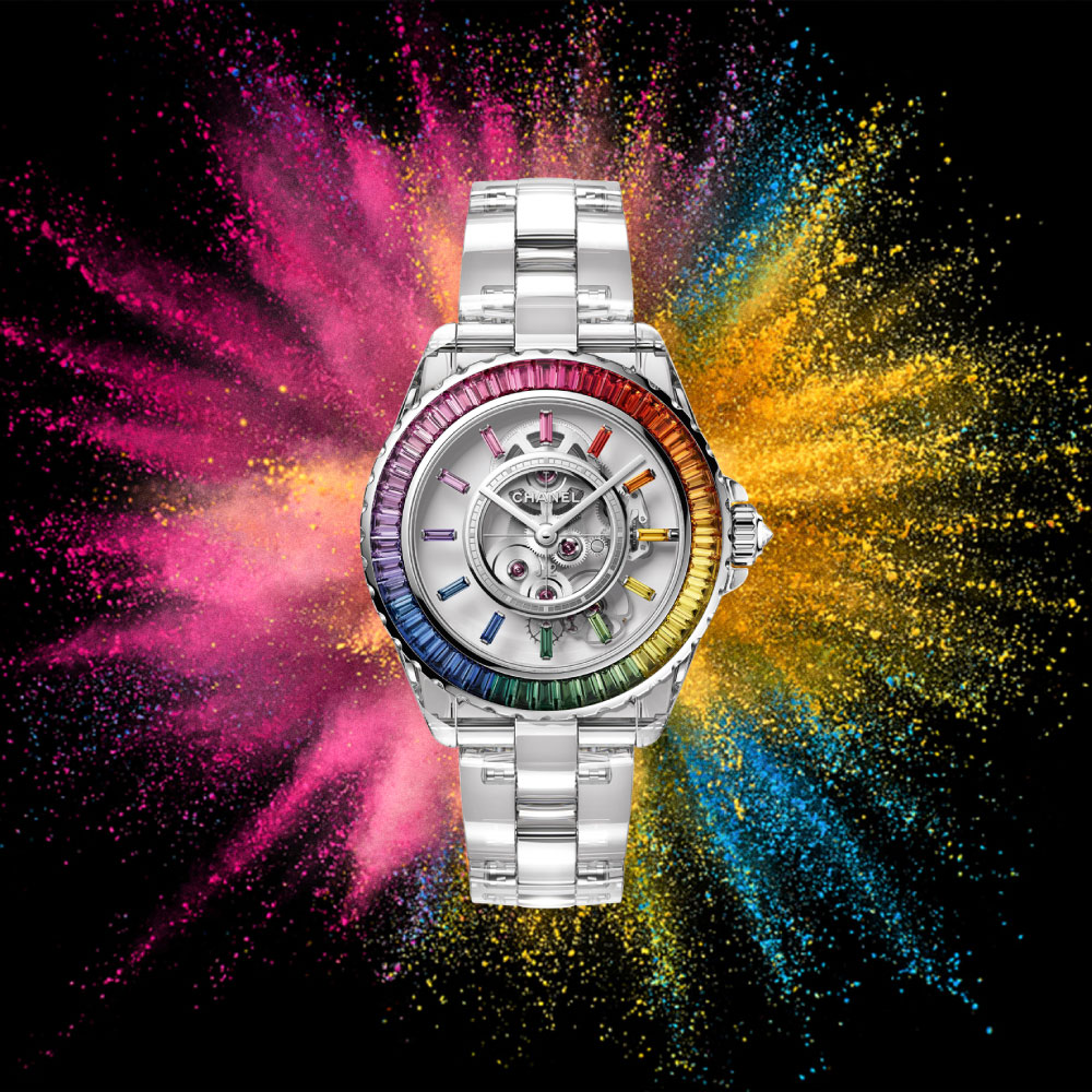 J12 X-Ray Electro Caliber 3.1 – nữ hoàng dạ tiệc từ Chanel được sản xuất giới hạn chỉ 12 chiếc. Được trang bị bộ chuyển động calibre 3.1 trữ năng lượng trong 55 giờ và chống nước 30m, J12 Xray Electro có 12 viên ngọc bích đa màu cắt hình baguette chỉ giờ. Sự phân cấp các sắc thái ở các điểm giờ hòa hợp với sự tinh tế của viền lắp kính bằng 58 viên sapphire. Hoàn thiện bởi dây đeo bằng sapphire và vàng trắng 18K tạo cảm giác thoải mái trên tay, phong cách thẩm mỹ ở tạo tác này sẽ biến mỗi quý cô thành nữ hoàng khiêu vũ khuấy động những buổi tiệc đêm: rực rỡ, cuồng nhiệt và đầy mê hoặc trong không gian âm nhạc electro khiến ai cũng phải say đắm ngắm nhìn.