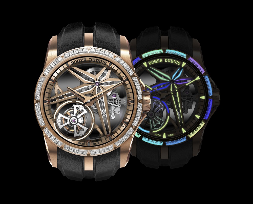 Excalibur Glow Me Up! là chiếc đồng hồ đầu tiên có gờ kính nạm kim cương baguette phát quang vào ban đêm với các màu sắc khác nhau nhờ vào một quy trình đã được cấp bằng sáng chế. Theo đó, đội ngũ kỹ thuật đã bổ sung vật liệu phát quang bên dưới những viên kim cương trong các rãnh giúp giữ những viên đá quý vào đúng vị trí. Excalibur Glow Me Up! cũng có bộ máy RD512SQ mới được tinh chỉnh lại với khả năng dự trữ năng lượng được cải thiện lên đến 72 giờ và tăng độ bền nhờ lớp bôi trơn mới. Khá vạm vỡ trong đường kính 44mm, vỏ tuyệt phẩm được làm bằng EON GOLD, một hợp kim vàng hồng không xỉn màu. Có khả năng đi nước 100m, tạo tác dành cho quý ông này sóng đôi dây da bê 3D màu đen trang bị hệ thống tháo lắp nhanh QRS.