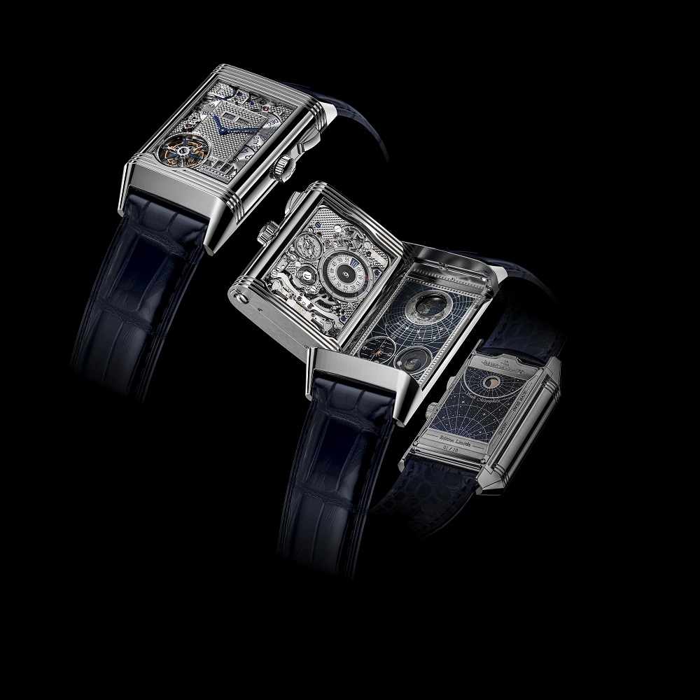Sau 6 năm thai nghén, Jaeger-LeCoultre khai sinh chiếc đồng hồ đầu tiên trên thế giới khoác vỏ vàng trắng. Tạo tác được điều khiển mượt mà bởi bộ máy Calibre 185 nội bộ có 50 giờ trữ năng lượng cùng một giá đỡ hai mặt với các chỉ số được đồng bộ hóa và cập nhật bởi bộ máy chính mỗi ngày vào lúc nửa đêm bởi một hệ thống cơ học khéo léo độc quyền. Bằng cách kết hợp ba màn hình hiển thị thông tin về mặt trăng trên mặt trong giá đỡ Reverso (chu kỳ giao hội, chu kỳ giao điểm thăng và chu kỳ điểm cận địa), tạo tác có thể dự đoán tỷ lệ toàn cầu tiếp theo của các sự kiện thiên văn như siêu trăng và nguyệt thực. Chiếc đồng hồ đeo tay đầu tiên trên thế giới cung cấp khả năng xem xét sâu về vũ trụ này sóng đôi dây da cá sấu màu xanh và giới hạn đúng 10 chiếc.