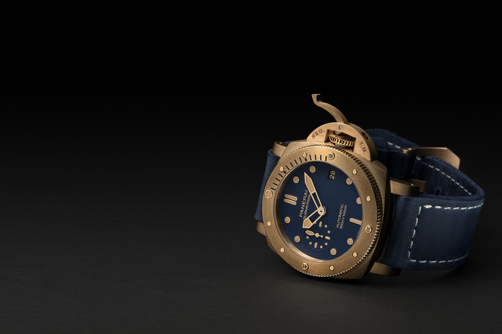 Chính thức trở lại sau màn ra mắt ấn tượng hồi năm 2011, chất liệu đồng mang tới cho Submersible Bronzo Blu Abisso 42mm cá tính mạnh mẽ và vẻ quyến rũ khác thường. Đặc tính thẩm mỹ này được nâng cao bởi đinh tán trên gờ kính chia độ, dãy các chấm và chỉ số phủ Super-LumiNovaTM màu be nổi lên từ mặt số xanh. Thỏa yêu cầu khắt khe của đồng hồ lặn chuyên dụng, tạo tác sở hữu gờ kính xoay một chiều chia độ, một thiết bị cầu có cần gạt bảo vệ núm vặn và kính sapphire cứng cáp lắp ở mặt sau. Yếu tố quan trọng nhất chi phối toàn bộ hoạt động, “trái tim” tự động, calibre P.900 có 3 ngày trữ năng lượng. Do Panerai thiết kế và sản xuất, đây là bộ máy đầu tiên có độ dày 4,2mm để kết hợp chức năng ngày. Cùng vị chủ nhân chinh phục vùng nước sâu tận 300m, Submersible Bronzo Blu Abisso sóng đôi dây da lộn vintage xanh lam với đường khâu khéo léo gắn khóa chốt hình thang bằng đồng, hoặc dây đeo cao su xanh.