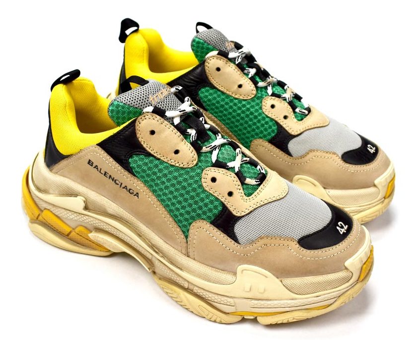 Mẫu sneaker Triple S cỡ lớn là mẫu giày nổi bật nhất của hãng thiết kế đến từ Tây Ban Nha này. Nó được sản xuất từ da lộn nubuck và vải lưới cao cấp, với logo của hãng được đặt một cách đầy tự hào ở phía sau, và phần đế giày ba lớp nổi bật. Mẫu giày này hiện tại là vua của xu hướng giày quá khổ.