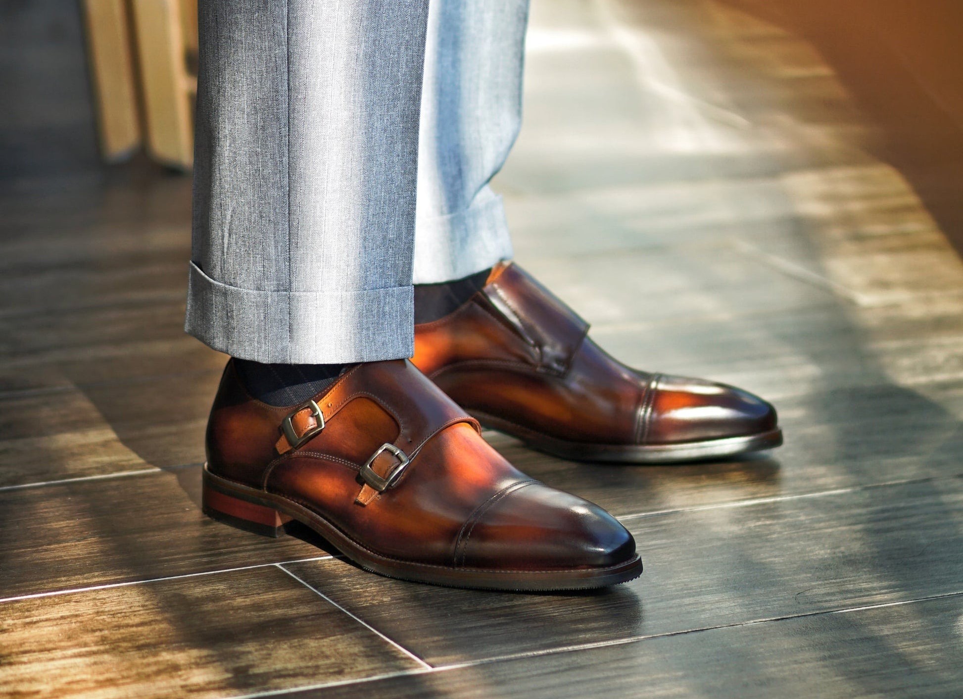 Monk strap, đặc trưng với phần khóa kim loại thay thế dây buộc, là lựa chọn hoàn hảo cho những quý ông muốn cân bằng giữa sự trang trọng và phong cách cá nhân. Monk strap mang tính formal vừa phải, hợp với suit công sở nhưng cũng có thể linh hoạt xuống phố. Single monk strap thanh lịch và tối giản, phù hợp với suit slim fit ôm vừa cơ thể hoặc suit công sở. Double monk strap phong trần, cá tính hơn, đặc biệt hợp với suit vải dày như flannel hoặc tweed. Sai lầm phổ biến nhất khi diện monk strap là chọn quần quá ôm, lộ phần tất hoặc ngược lại, quần quá dài che hết khóa kim loại – chi tiết tinh hoa nhất của đôi giày.