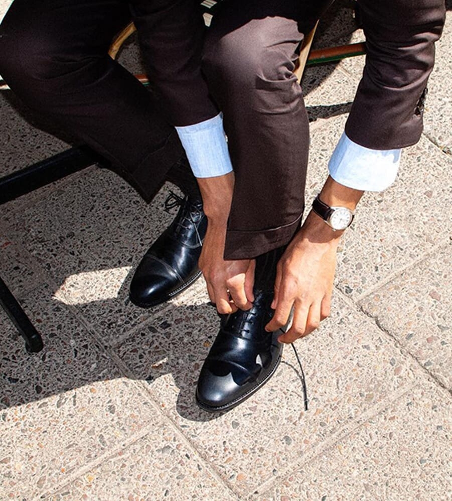 Dù sneaker có được yêu thích thế nào, nó vẫn khó thay thế được sự chỉn chu của một đôi giày da khi đi cùng suit. Đặc biệt với một bộ suit bespoke, sự hiện diện của giày thể thao có thể phá hỏng hoàn toàn tinh thần sang trọng vốn có. Bên cạnh đó, việc chăm sóc giày cũng quan trọng không kém. Một đôi giày đẹp nhưng thiếu đánh xi, mất form hay kém sạch sẽ sẽ kéo cả bộ trang phục xuống, làm giảm đi sự lịch lãm mà bạn hướng tới.