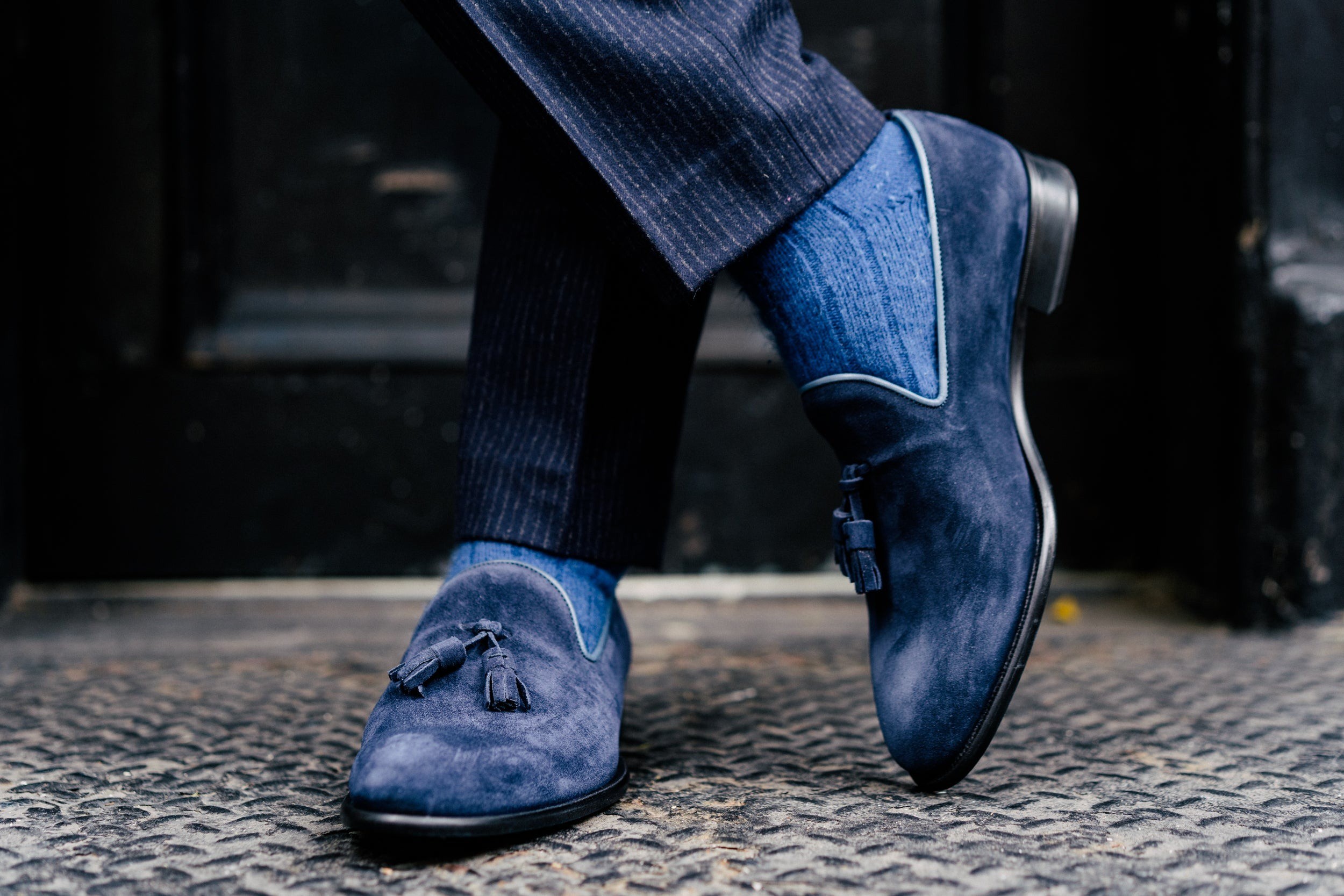 Giữa những lựa chọn da trơn, da lộn (suede) nổi lên như một điểm sáng của sự sáng tạo và phá cách đầy tinh tế. Kết cấu mềm mại, màu sắc đa dạng, giày da lộn dễ dàng kết hợp với suit vải nhẹ cho mùa hè. Suede loafers nâu hoặc xanh navy dễ dàng đi cùng suit cotton, linen hoặc lụa pha, mang lại cảm giác sang trọng nhưng rất thư thái. Derby hoặc chukka da lộn lại phù hợp hơn cho suit casual, nhất là những bộ suit không cấu trúc, tạo nên diện mạo phong trần nhưng không kém phần lịch thiệp.