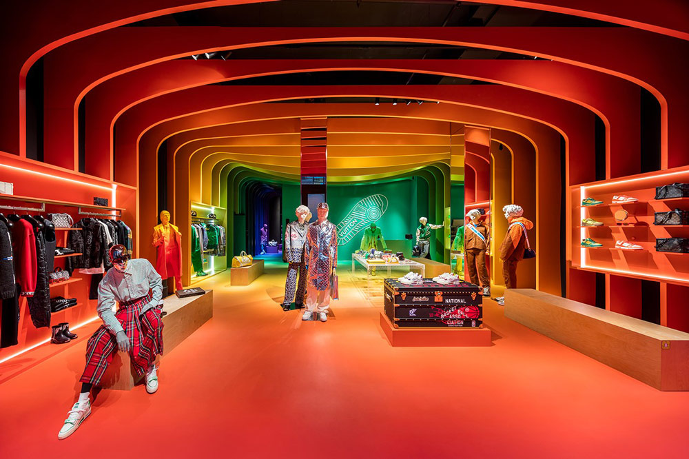 Những mái vòm màu neon được lấy cảm hứng từ Pont Neuf ở Paris và dải cầu vồng sắc màu sẽ làm nổi bật nội thất của cửa hàng một cách sống động. Việc sử dụng màu sắc vui tươi đã từng tạo nên dấu ấn cho buổi trình diễn đầu tiên của Abloh với dòng thời trang nam Louis Vuitton mùa xuân năm 2019. Dường như Virgil Abloh đã liên hệ sứ mệnh của bản thân để đưa vào ý tưởng thiết kế cho bộ sưu tập lần này. Các mẫu thiết kế từ dây xích Cuba như dây chuyền và vòng tay phù hợp với từng bộ sưu tập đều được trưng bày. Tất cả đều mang sắc đỏ để phù hợp với hoạ tiết cầu vồng của cửa hàng. Một sản phẩm bán chạy khác là kính râm 1.1 Millionaires cũng được trưng bày ở cửa hàng.