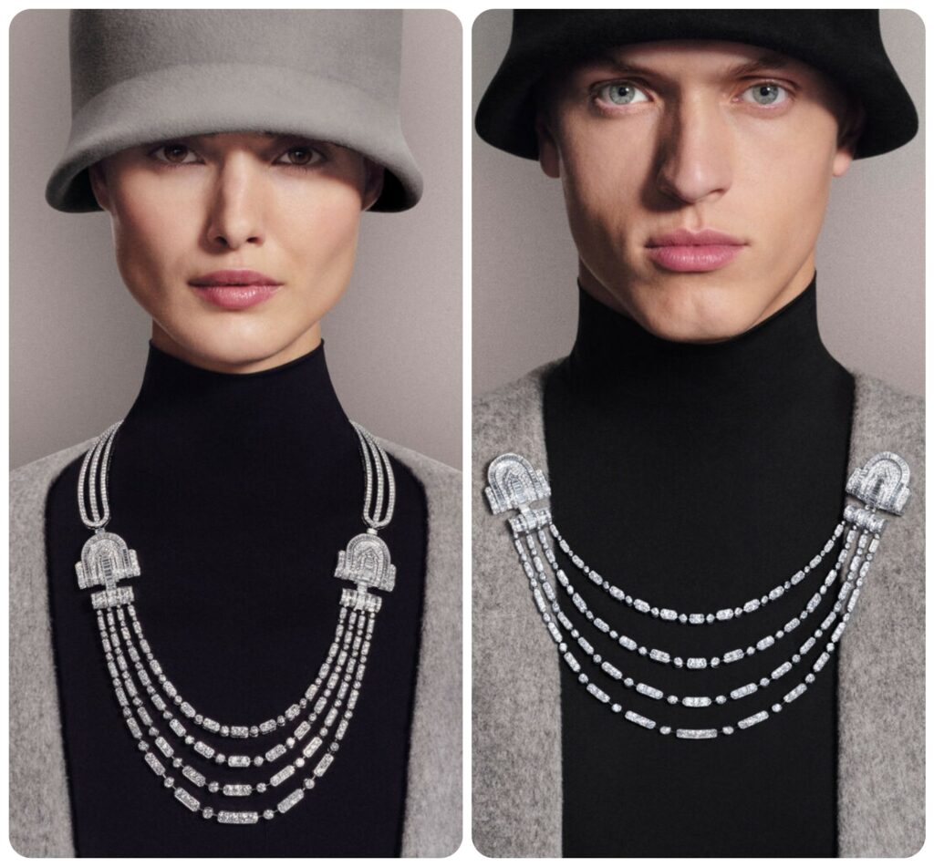 Moon White kết hợp vẻ dịu dàng của ngọc trai Akoya với ánh sáng rực rỡ của kim cương. Vòng cổ ba tầng với khóa Art Deco tháo rời có thể trở thành trang sức tóc hay brooch đôi.