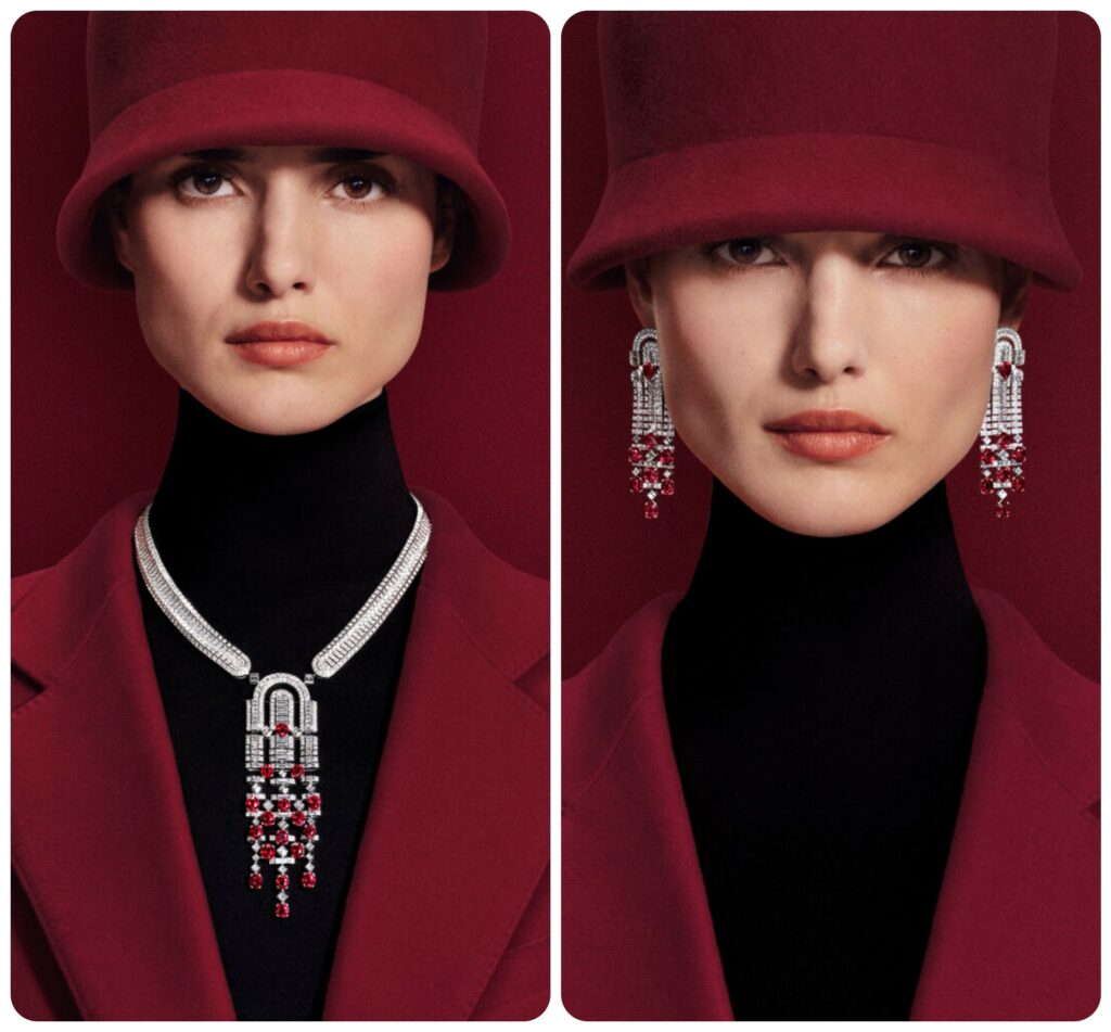 Rolling Red rực rỡ với ruby và kim cương, nổi bật ở chi tiết trung tâm có thể tháo rời thành brooch. Đường nét thiết kế được kéo dài, mang hơi thở hiện đại nhưng vẫn giữ nguyên chất quý tộc.