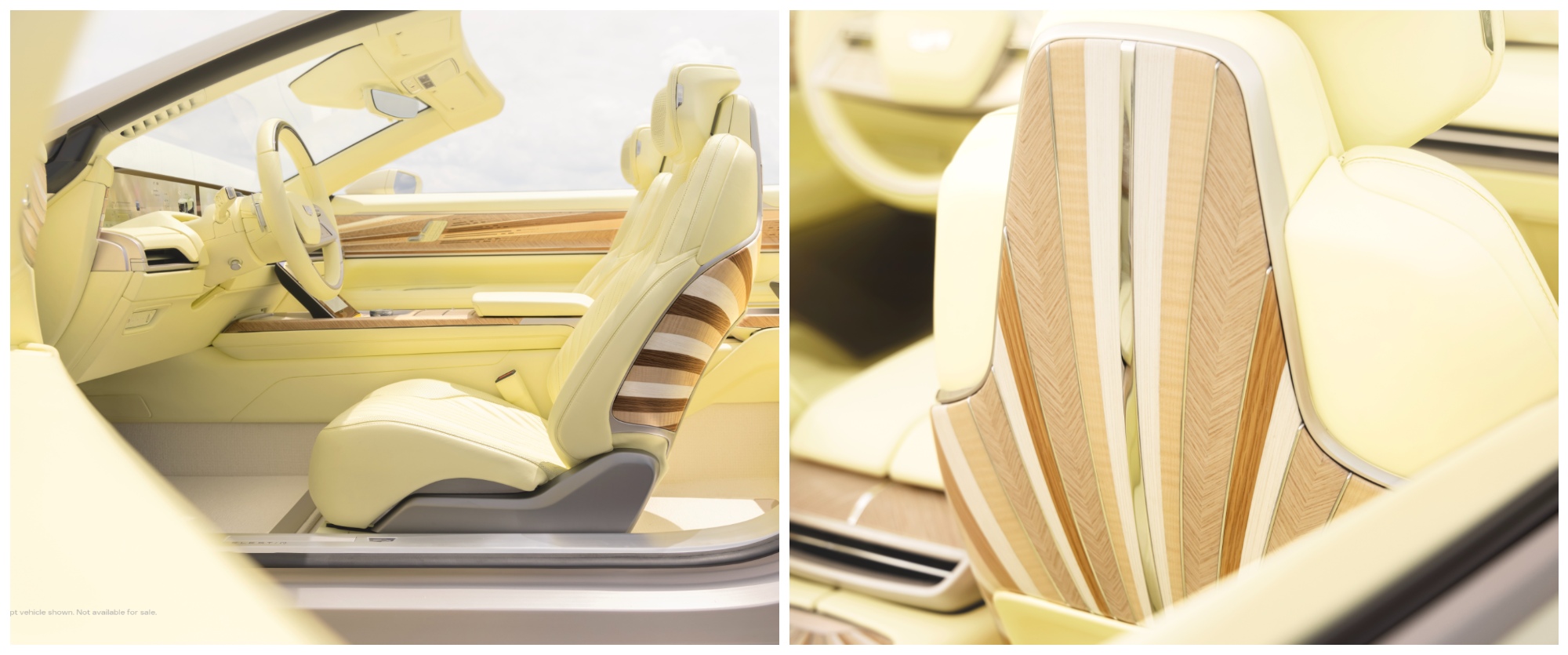 Nội thất bọc gỗ veneer không nhuộm màu, tôn vinh các biến thể màu sắc và hoa văn tự nhiên, trong khi bề mặt có lớp hoàn thiện lỗ rỗng mở có thể cảm nhận bằng cách chạm vào. Từng yếu tố được cắt, khảm thủ công tạo điểm nhấn đẹp mắt thu hút ánh nhìn từ cửa trước đến bảng điều khiển và khoang sau. Trong khi đó, kính chắn gió được viền khung bằng nhôm xước tiếp tục chủ đề khai thác công năng vật liệu tự nhiên của Cadillac.