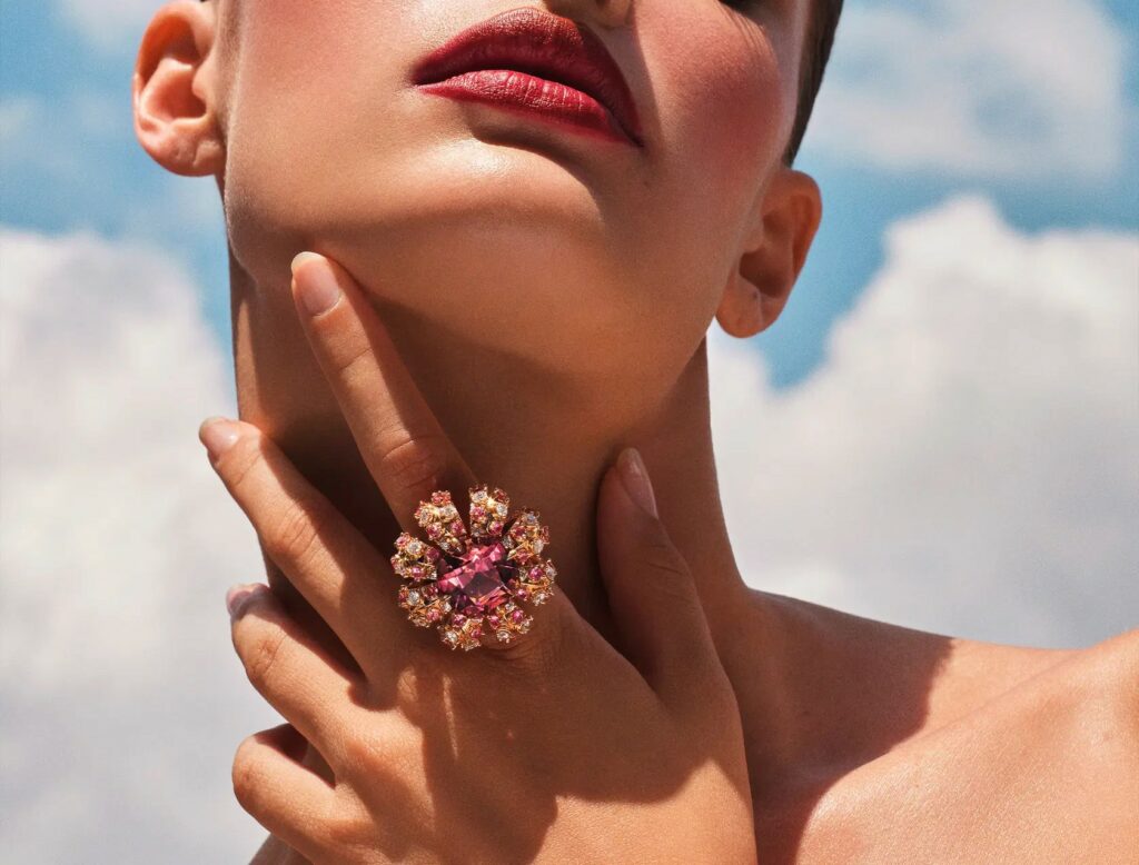 Với nhẫn Akkoro, Cartier đưa người xem đến vùng đất đỏ nắng gió, nơi những viên tourmaline hồng nâu và sapphire Umba trở thành điểm nhấn đầy mê hoặc. Được chế tác từ vàng hồng và đính kim cương, thiết kế này gợi cảm giác ấm áp, nữ tính nhưng không kém phần kiêu hãnh. Nhẫn Akkoro là minh chứng cho sự cân bằng hoàn hảo giữa màu sắc tự nhiên và kỹ thuật chế tác tinh xảo, khơi gợi hình ảnh những vùng hoang dã đậm chất châu Phi.