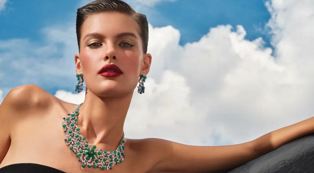 Tuy nhiên, chương cuối này không chỉ dừng lại ở cảm hứng từ thú hoang. Cartier đã khéo léo chuyển hướng sang chính môi trường sống của chúng nơi thiên nhiên được tái hiện trong dáng hình siêu thực và đầy chất thơ. Vòng cổ Panthères Versatiles với viên ngọc lục bảo Zambia 10.10 carat có thể biến hình từ vòng cổ ôm sát cổ sang mẫu dây rơi nhẹ xuống lưng, cho thấy khả năng biến hóa tinh xảo của kỹ thuật chế tác.