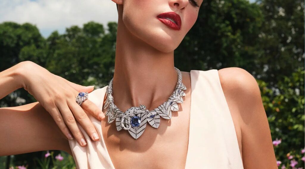 ột trong những thiết kế nổi bật nhất là vòng cổ Panthère Canopée nơi chú báo đốm nằm gọn trong hõm xương quai xanh, đôi mắt xa xăm, dáng hình mềm mại ôm trọn viên sapphire Ceylon 26.53 carat. Được chạm khắc từ onyx và kim cương, tạo tác này vừa kiến trúc, vừa mê hoặc, thể hiện rõ di sản thẩm mỹ của Cartier về động vật học vốn bắt đầu từ năm 1914 với chiếc đồng hồ báo đốm đầu tiên.