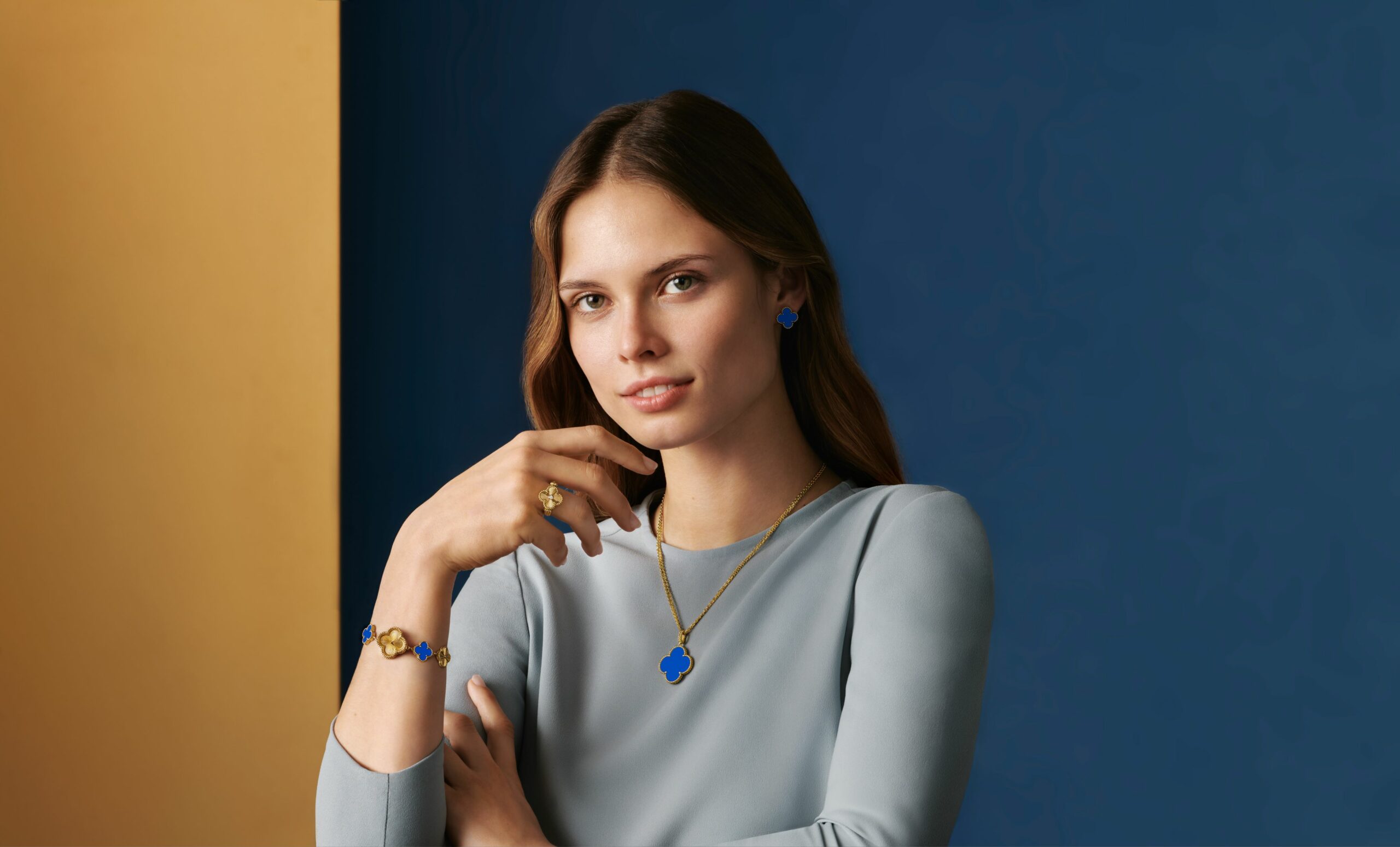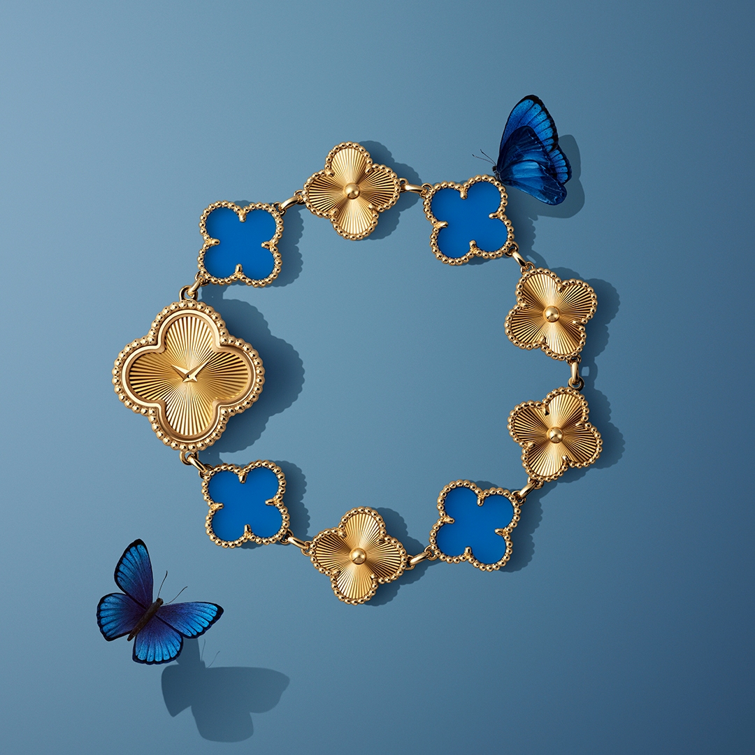 toàn đáp ứng các tiêu chuẩn lựa chọn nghiêm ngặt, cả về màu sắc rực rỡ lẫn bề mặt sáng bóng. Để tạo nên tổng thể hài hòa, họa tiết cỏ bốn lá – biểu tượng cho sự may mắn – được ghép chính xác vào từng sản phẩm. Sự khác biệt đôi chút về độ trong mờ giữa những viên đá mang đến cho từng sáng tạo nét độc đáo và quyến rũ riêng.