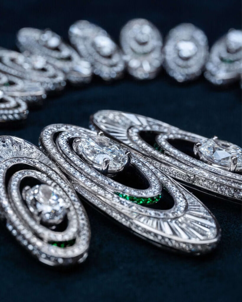 Graff tôn vinh thập niên 1960 với 1963 Collection, nổi bật bởi cấu trúc oval đồng tâm nạm hơn 7.790 viên kim cương, tổng cộng 129 carat, cùng điểm nhấn pavé emerald kín đáo, gợi nhắc sắc xanh biểu tượng của thương hiệu.