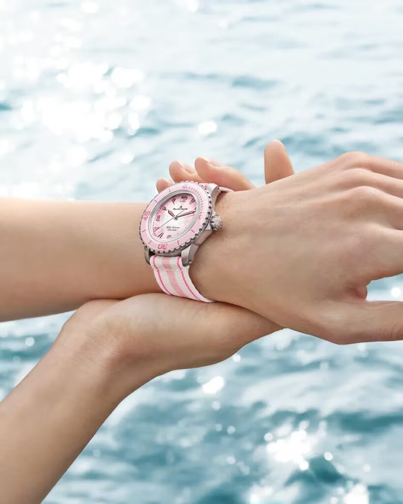 Hai mẫu mới nhất thuộc dòng Fifty Fathoms Automatique dành cho nữ sở hữu vỏ 38mm không chỉ là sự thu nhỏ đơn thuần mà là một tái kiến tạo có chủ đích. Phiên bản mặt số đen sử dụng hiệu ứng dégradé cuốn hút, kết hợp cùng vỏ vàng hồng đánh bóng và các lựa chọn dây đeo đa dạng: cao su tropic, vải dù đen hoặc vải NATO, mang lại vẻ linh hoạt từ ban ngày đến đêm tối. Trong khi đó, phiên bản mặt số hồng từ xà cừ ánh ngọc, đặt trong bộ vỏ titanium chải xước với bezel sapphire phát sáng, gợi cảm giác trẻ trung, sôi động và đầy năng lượng tích cực.