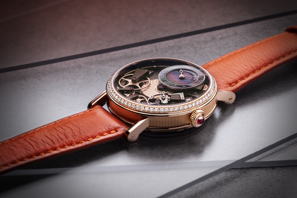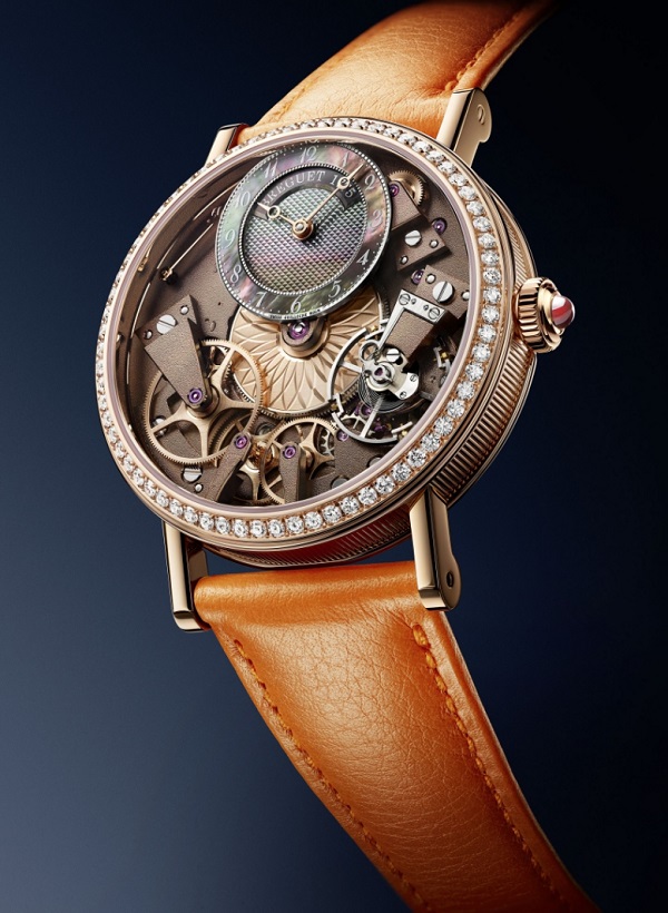 Là phiên bản đặc biệt chỉ xuất hiện trong những Boutique tại các thành phố lớn, Breguet Tradition Dame 7038 nổi bật với lớp vỏ 37mm bằng vàng hồng nạm kim cương tô điểm cho mặt số mở phô bày những chi tiết tinh xảo cùng bộ chuyển động nhịp nhàng hòa hợp với dây đeo bằng da bê màu cam đỏ nồng nàn như tôn vinh cổ tay ngà ngọc của vị chủ nhân.