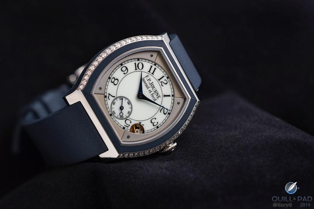 Từ đây, chúng ta có thể nhận thấy rằng nền tảng văn hóa của khách hàng đóng một vai trò lớn vì không phải thị trường nào cũng công nhận rằng chúng thích hợp cho đồng hồ nam. Khi F.P. Journe giới thiệu Élégante, tạo tác đã tạo nên một cơn chấn động nho nhỏ khi không chỉ là bộ sưu tập đầu tiên của thương hiệu phục vụ phái đẹp mà nó còn được vận hành bởi bộ máy quartz. Điều này khá kỳ lạ đối với một nghệ nhân đồng hồ bậc thầy được xem như là một trong những nhà chế tác xuất sắc nhất trong thế hệ của ông. Chiếc Élégante chạy bằng pin mà ông đã tạo ra sở hữu vỏ theo phong cách Vagabondage và bộ máy quartz bên cạnh một cây cầu vàng hồng. Thiết kế này được trang bị khá nhiều tính năng hấp dẫn các quý ngài, thế nhưng bộ vỏ 40mm đính kim cương kết hợp dây đeo bằng cao su với các màu như phấn hồng và xanh dương có lẽ khiến hầu hết họ e ngại. François-Paul Journe chắc hẳn đã nhận ra điều này và “sửa sai” trên chiếc Élégante ngoại cỡ 48mm.