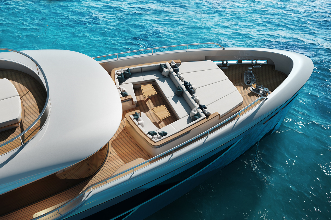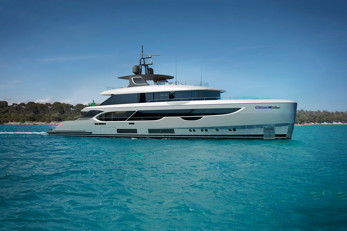 Nhắm tới đối tượng khách hàng muốn được gần gũi với đại dương, phần đuôi của chiếc Oasis 135 giống như một hộp đêm riêng tư cạnh bãi biển. Tâm điểm của du thuyền là bể bơi có diện tích sáu mét vuông, với ba cạnh bằng kính trong suốt để nhìn thấy toàn cảnh đại dương bao la.