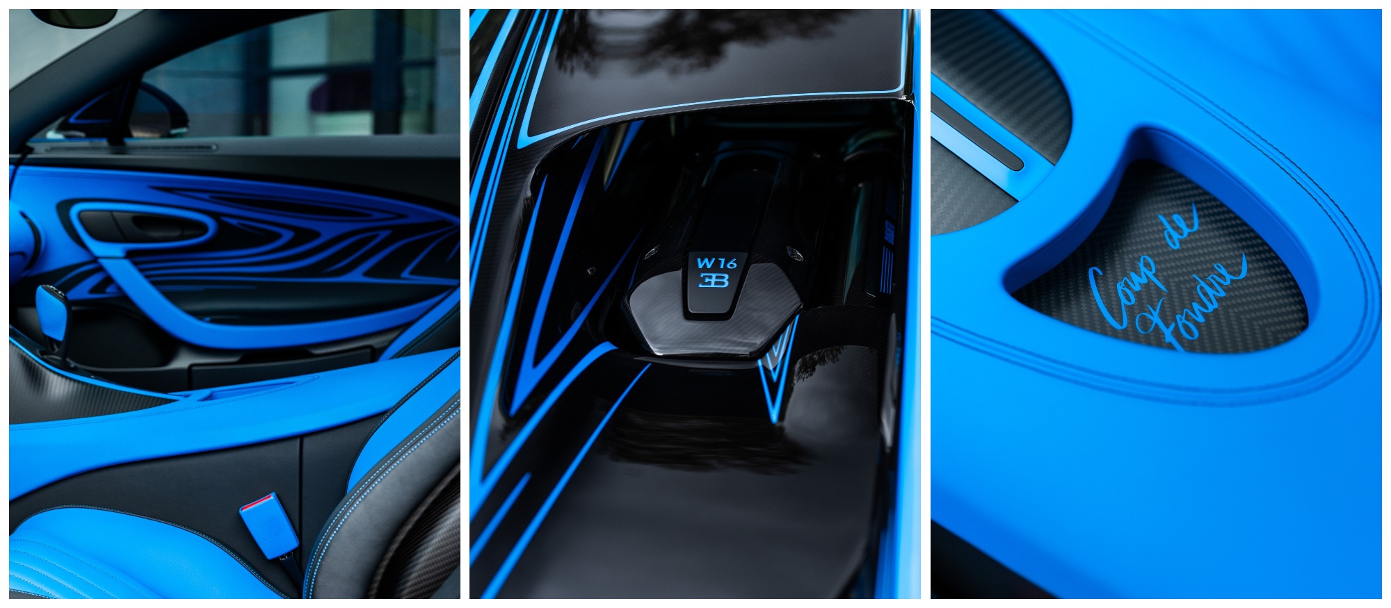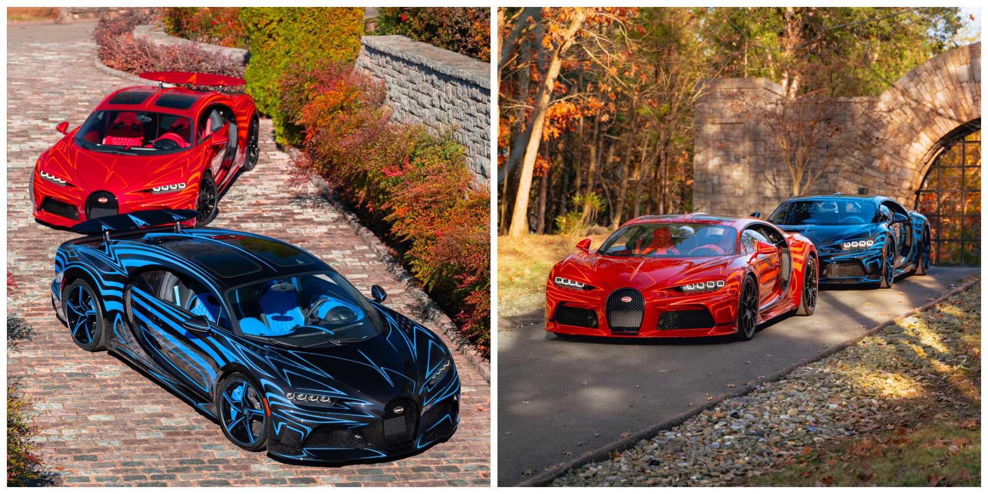 Về phần mình, thương hiệu Bugatti kể về tình yêu của một người chồng dành cho vợ mình qua hai chiếc Chiron Super Sport trang trí họa tiết vẽ tay do các nhà thiết kế Bugatti Sur Mesure đảm nhiệm. Quá trình phức tạp để tạo ra sơ đồ sơn đặc biệt này mất nhiều tuần, bắt đầu bằng việc tạo ra các hình dạng 2D thể hiện các đường nét sẽ chạy dọc trên thân xe ô tô, chúng phải được dán lên bề mặt 3D của ô tô với độ chính xác đến từng milimet. Sau đó, mỗi milimet sẽ được vẽ tỉ mỉ bằng tay, từng lớp một, để tạo nên 2 phiên bản đặc biệt xanh Tiffany và Cam cháy.