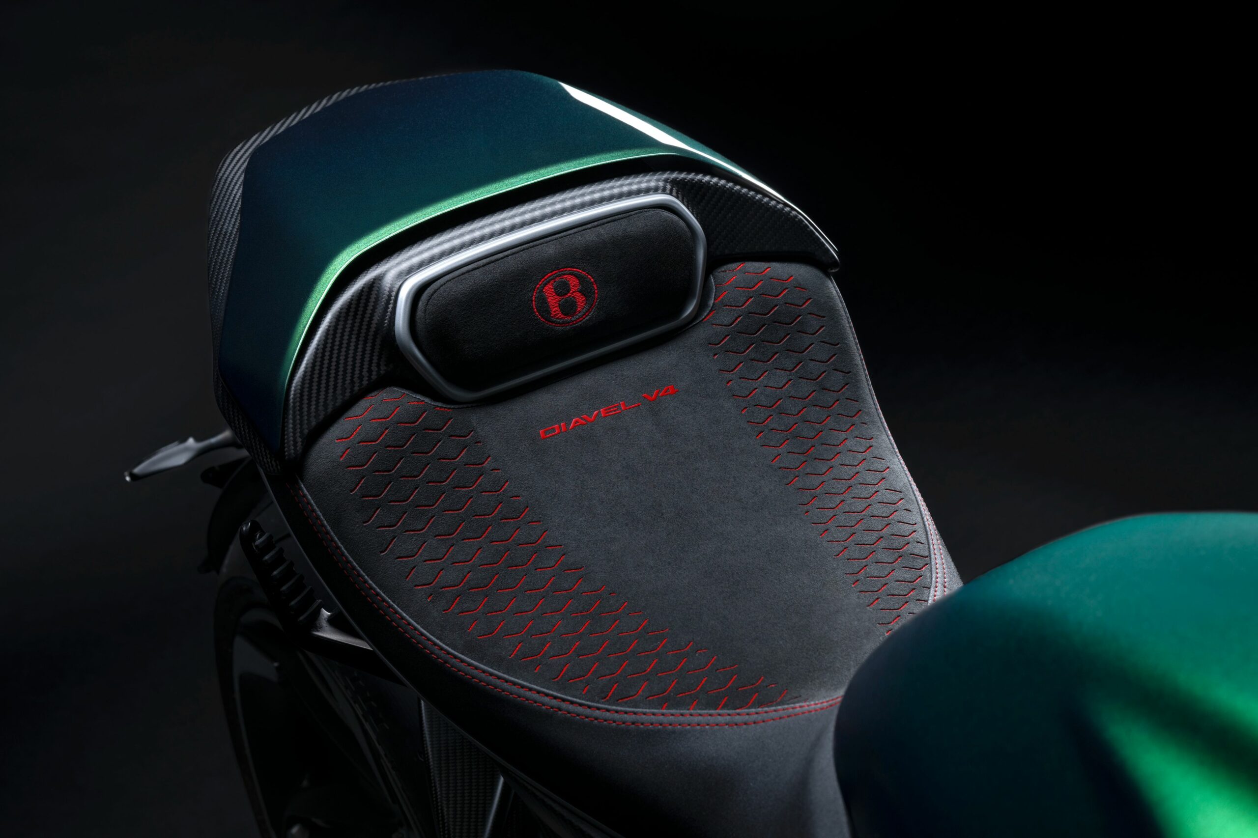 Cũng với nguồn cảm hứng dạt dào lấy từ nội thất ô tô, ghế của người lái bọc da Alcantara đen, để lộ lớp vải màu đỏ bên dưới tương tự ghế trang bị cho Batur đồng thời trưng bày logo Bentley thêu trên đệm tựa. Trong khi đó, ống xả kép có nắp đậy được thiết kế lại, hài hòa với những đường nét tinh tế của Ducati Diavel For Bentley.