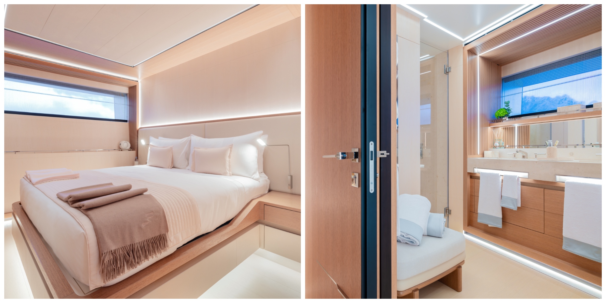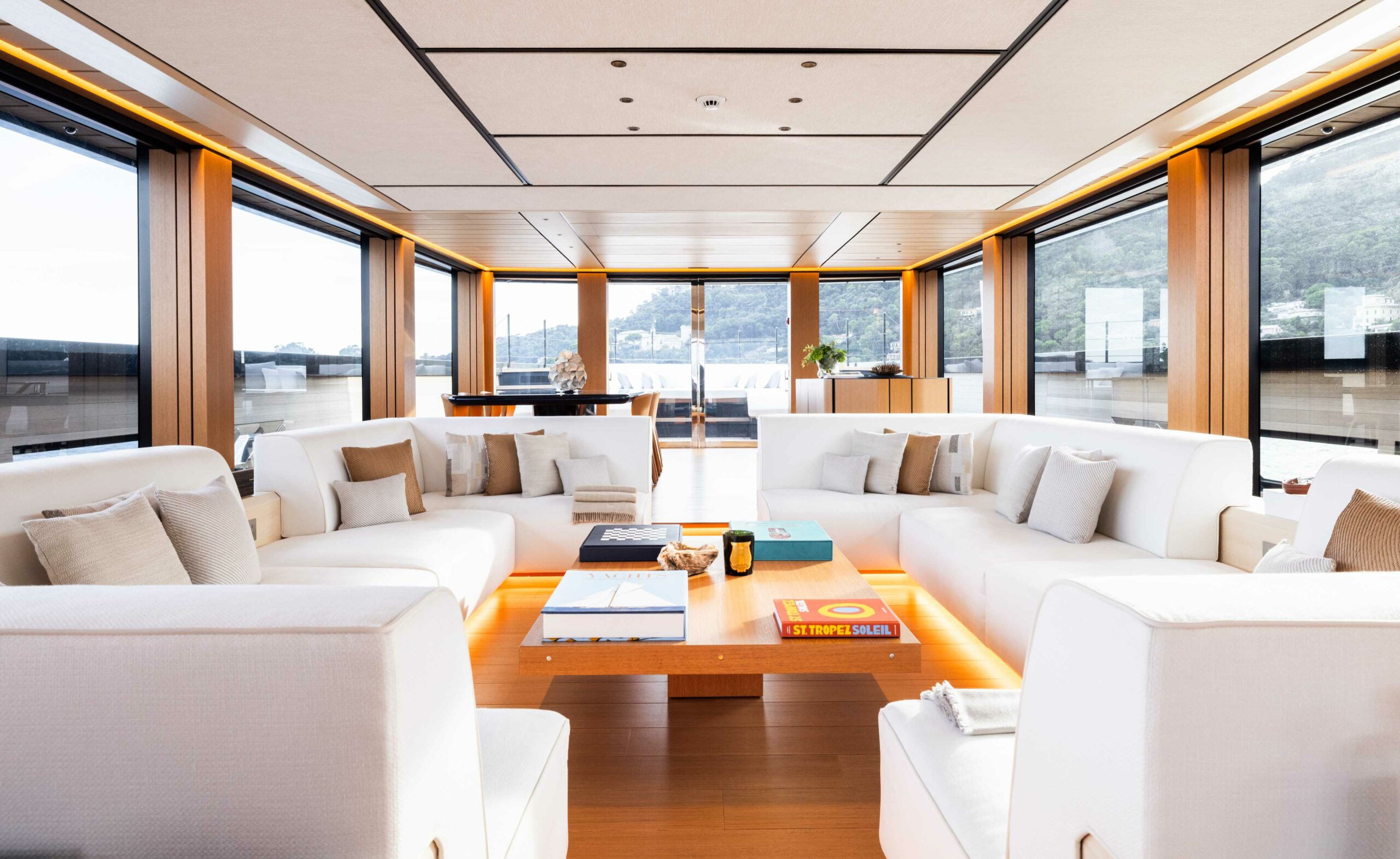 Thiết kế nội thất hài hòa với dáng vẻ bên ngoài, mang đến nét đẹp tinh tế, thanh lịch. Chỉ 15 vật liệu cao cấp như teak, gỗ sồi nhuộm màu, gỗ bạch đàn và da màu nâu nhạt được sử dụng xuyên suốt du thuyền. Dù phong cách thiết kế tối giản, không gian vẫn toát lên sự ấm áp với những chi tiết tinh xảo như mộng bướm trong mộc, da khâu tay và điểm nhấn bằng thép không gỉ. Ngoài vài món nội thất rời, toàn bộ đồ nội thất cố định đều do Alia Interiors Atelier sản xuất. Phong cách tinh tế này cũng được duy trì ở các phòng khách dưới boong, tiếp cận qua cầu thang xoắn phía sau quầy bar trong phòng khách chính.