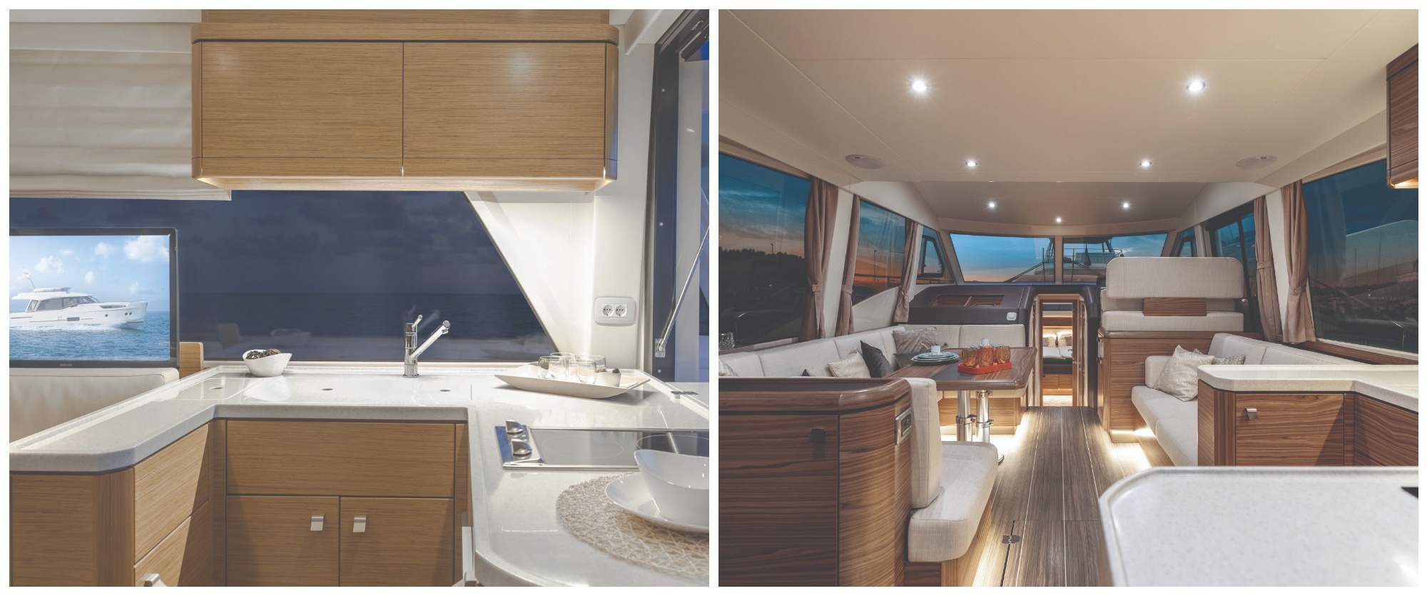Hoạt động trên thuyền tập trung xung quanh boong chính với saloon rộng rãi, buồng lái được bảo hộ kỹ cùng các không gian thư giãn trước, sau. Thiết kế của Greenline 48 hoàn toàn không có bậc thang nào ở boong chính giữa khoang lái và boong sau, tạo nên không gian thoải mái cho hải trình thong dong trên sóng nước. Một đặc điểm đáng chú ý khác không thể bỏ qua, chính là bếp phía sau, cho phép tiếp cận cả phòng khách lẫn buồng lái thông qua cửa sổ mở và cửa trượt. Giám đốc Thương mại Luca Raumland cho biết: “Chúng tôi luôn tự hào về đặc điểm thú vị này, vì cho phép người đứng bếp bắt đầu chuẩn bị bữa ăn kịp thời mà không bỏ lỡ cuộc trò chuyện cùng khách hoặc các thành viên trong gia đình. Cách bố trí như thế hiện có mặt trên trên tất cả các loại thuyền, nhưng vào năm 2008, nó thật sự là nghệ thuật đổi mới đầy sáng tạo của Greenline”.