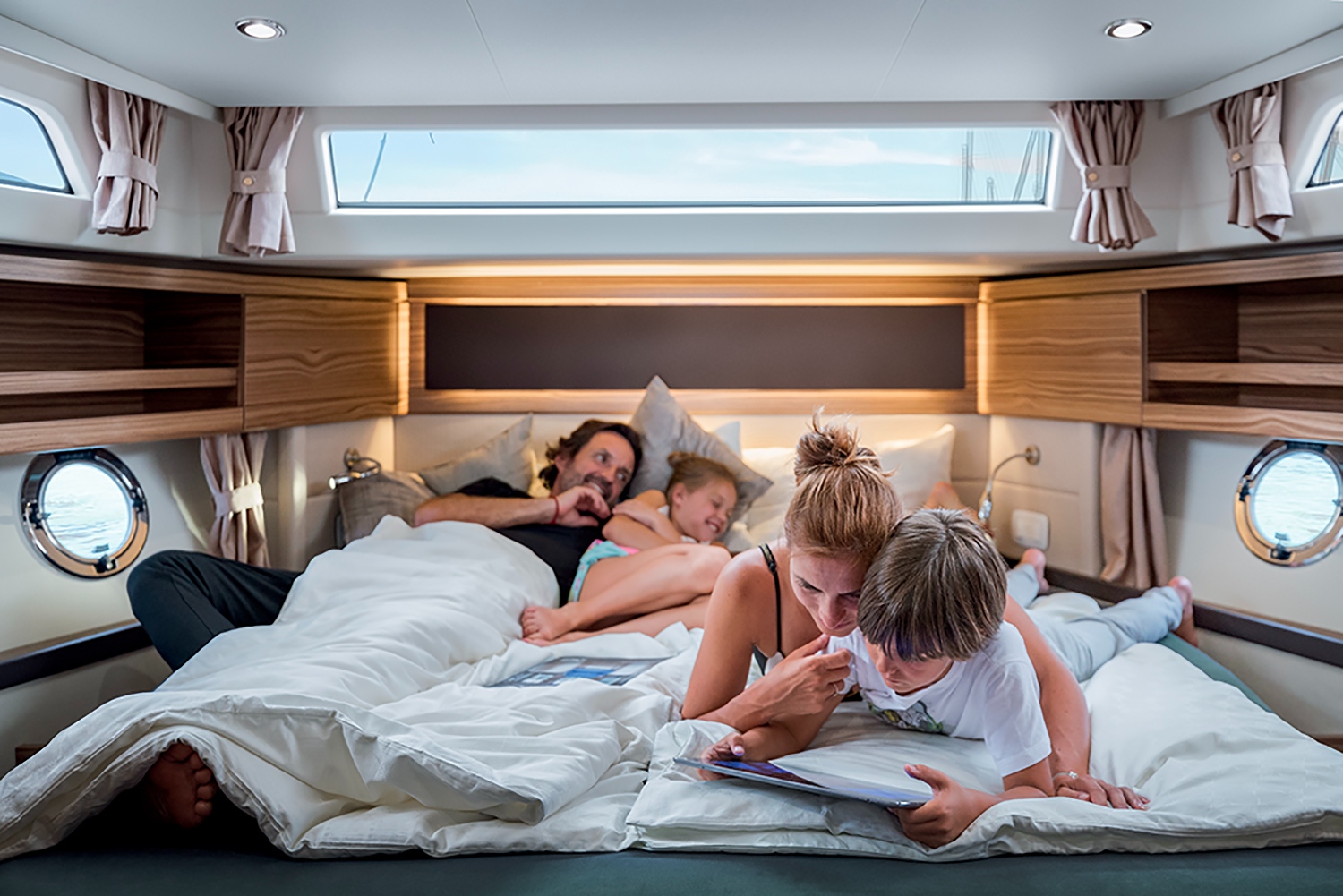 Trong khi đó, thân thuyền sở hữu thiết kế thông minh, với đáy trước tương đối rộng và nông, đồng nghĩa với việc những con sóng nhỏ lướt qua thay vì vỗ mạnh vào mặt trên tạo cảm giác khó chịu, khi ở trạng thái neo. Trên thực tế, phần phía trước gợi nhớ nhiều hơn đến một chiếc thuyền buồm, có khả năng vượt qua vô vàn con sóng biển. Không gian lưu trú được đội ngũ thiết kế cân nhắc kỹ lưỡng trước khi mang đến cấu hình 3 ensuite cabin ở tầng dưới, bao gồm master cabin ở đầu thuyền và hai cabin lớn dành cho khách có giường trượt linh hoạt chuyển từ hai giường đơn thành giường đôi. Thêm vào đó, mỗi cabin đều trang bị phòng tắm riêng, hoàn chỉnh với vòi hoa sen. Hơn nữa, tùy chọn xây dựng cabin thuyền trưởng hoàn toàn độc lập phía sau bằng cách từ bỏ một phần lazarette – khu vực gần/hoặc phía sau buồng lái – khá lớn.