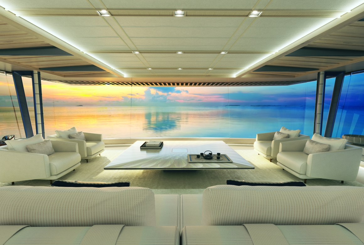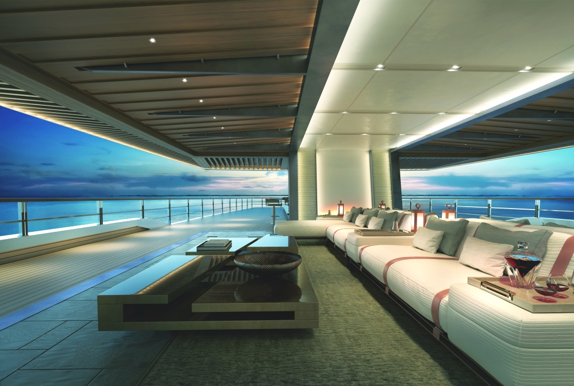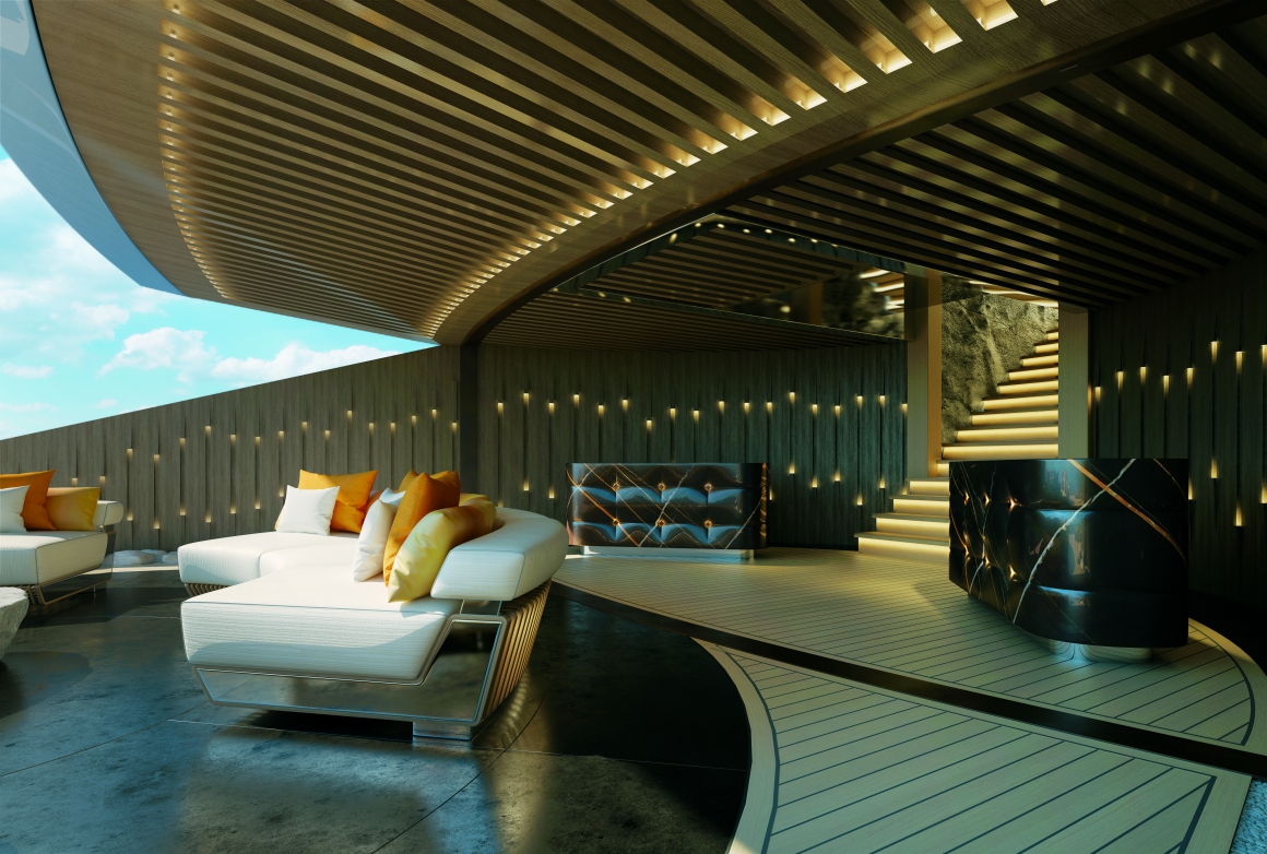 Phần sau của siêu cấu trúc là phòng lounge 13m với các vách và góc kính mở hoàn toàn ra boong bên ngoài có diện tích 500m2. Giữa phòng ăn là các cửa trượt có thể kéo lại hoàn toàn và một cửa mái, trong khi đài chỉ huy công nghệ cao ở phía trước có hệ thống điều khiển nổi và ghế cho khách. Dù sở hữu mặt tiền kính 360 độ, nhưng phòng lounge và các phòng ăn đều toát lên sự gần gũi nhờ sự hỗ trơ của mái che.