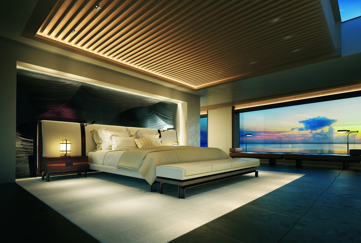 Nhận ra rằng chủ thuyền dành phần lớn thời gian ở một vài khu vực ưa thích, Sinot và Feadship đã tập trung xây dựng không gian ở hai tầng. Phòng chính 12,8m của chủ thuyền tại phần trước của boong chính, bao gồm phòng lounge sang trọng, phòng làm việc, phòng quần áo và phòng tắm, được bao quanh bởi những bức tường kính cao vút mở ra tầm nhìn khoáng đạt. Bên cạnh đó là sự lựa chọn bốn cabin VIP hoặc hai cabin VIP và bốn phòng khách.