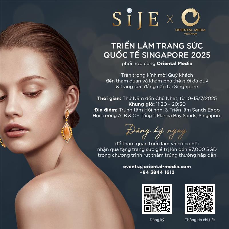 Triển lãm Trang sức Quốc tế Singapore (SIJE 2025) sẽ chính thức diễn ra từ ngày 10 đến 13 tháng 7 tại Trung tâm Hội nghị & Triển lãm Sands Expo, quy tụ các nhà kim hoàn hàng đầu thế giới cùng hàng ngàn tuyệt phẩm đá quý, trang sức cao cấp và thiết kế đương đại. Năm nay, Oriental Media Vietnam hân hạnh là đơn vị đồng hành truyền thông kết nối cộng đồng đam mê trang sức Việt Nam với một trong những sự kiện danh giá nhất khu vực châu Á.