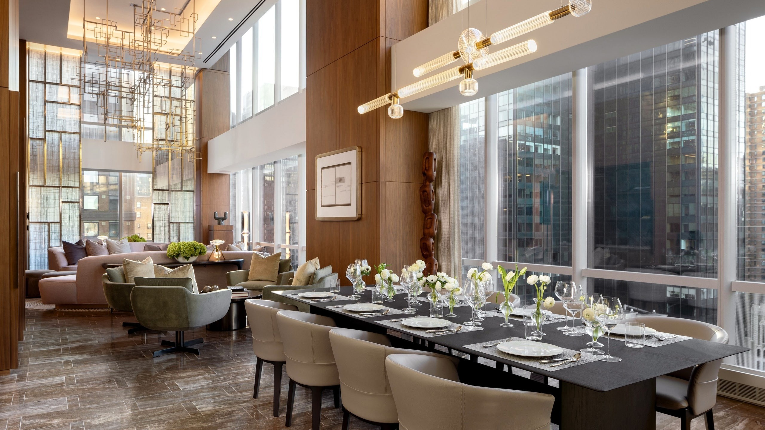 Khu vực tiếp khách rộng rãi được thiết kế thanh lịch, thích hợp cho các buổi gặp gỡ xã hội hay hội họp, với tâm điểm là một bàn ăn dành cho tám người cùng bộ dụng cụ ăn uống của Bernardaud rất sang trọng. Nhà bếp được trang bị các thiết bị cao cấp từ Miele như lò vi sóng, lò nướng, bếp từ, máy rửa bát và tủ lạnh kết hợp (Master Cool), mang đến cảm giác thoải mái, tiện nghi như ở nhà. Phòng ngủ chính của Manhattan Suite còn được trang bị quầy bar riêng, kèm theo bộ sưu tập rượu vang nổi tiếng. Bạn sẽ ngủ một giấc thật ngon trên chiếc giường king-size Bryte Balance trải drap Sferra, được tích hợp công nghệ đa giác quan giúp cải thiện giấc ngủ và giảm thiểu cảm giác mệt mỏi sau chuyến bay. Các tiện nghi trong phòng tắm bao gồm sản phẩm từ Le Labo và máy sấy tóc cao cấp từ stylist nổi tiếng Rossano Ferretti. Phòng tắm chính được thiết kế lộng lẫy, với bồn tắm lớn bằng đá cẩm thạch, vòi tắm mưa tích hợp phòng xông hơi, và các tiện ích hiện đại như bồn cầu điện Toto và bidet.