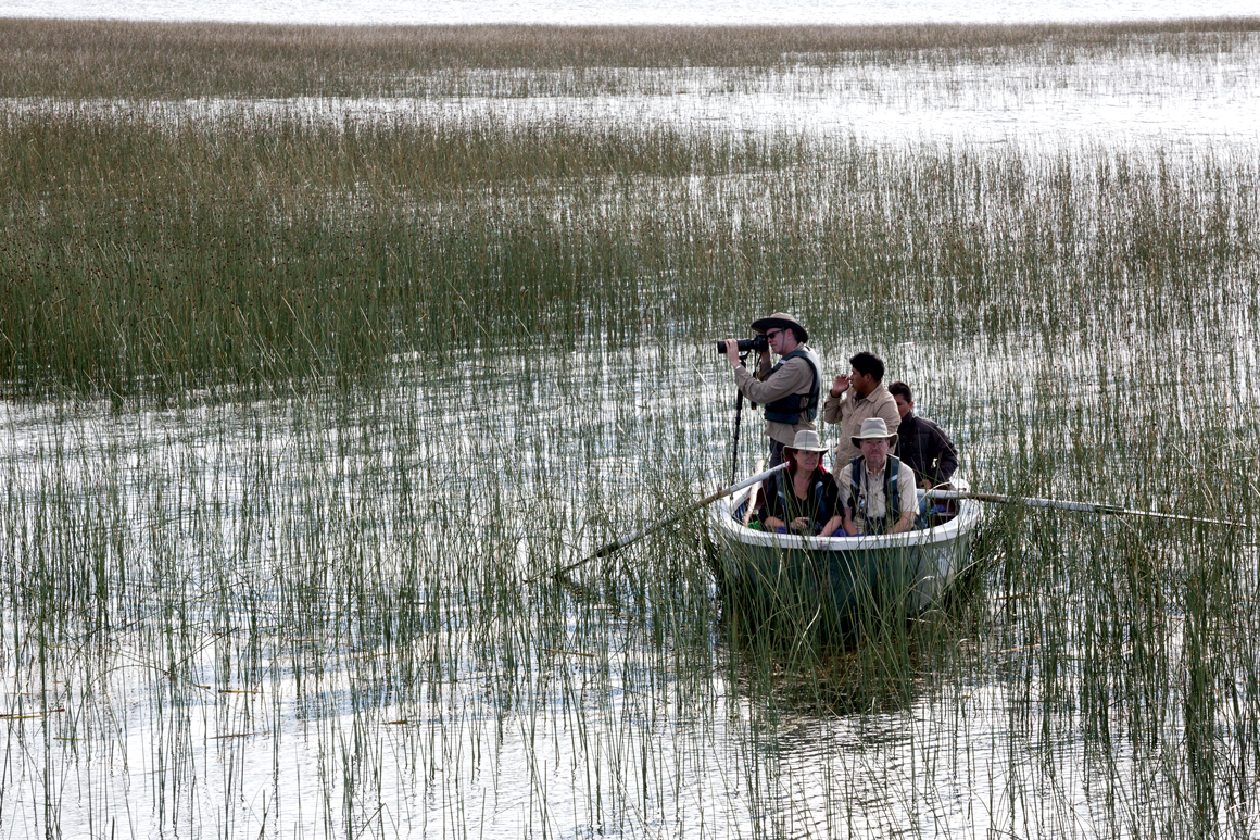 Du khách đang ngồi trên thuyền để ngắm các loài điều cầm quý hiếm
