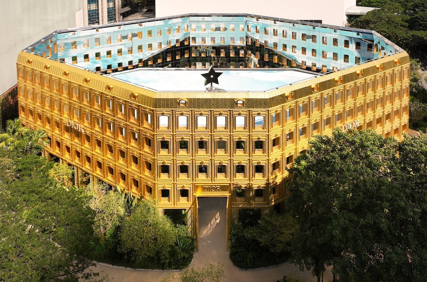 ông trình kiến trúc hoành tráng – hoàn toàn được trang trí bằng vàng, biểu tượng vĩnh cửu của Dior – được đặt giữa một khu vườn nhiệt đới và lấy cảm hứng từ mặt tiền của ngôi nhà tại 30 Avenue Montaigne, nơi được coi là cái nôi của haute couture Paris, đồng thời cũng là địa điểm Monsieur Dior thành lập thương hiệu của mình vào năm 1946.