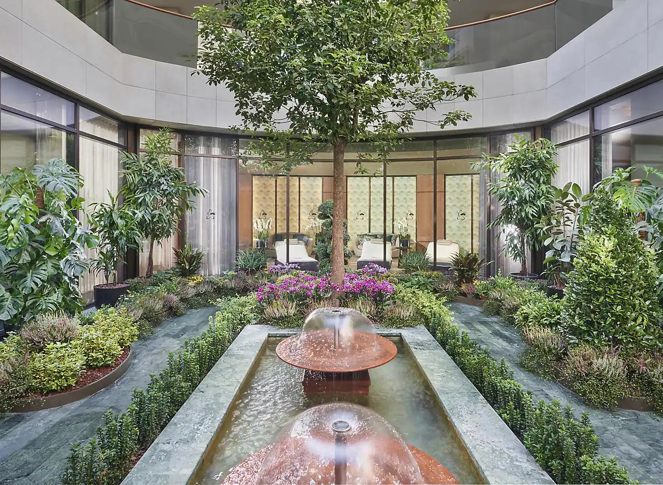 Thang máy đưa khách lên tầng 1, 2, 3 lướt qua giếng trời được bao quanh bởi bức tường trong suốt một phần, được làm từ gỗ redgum Úc, tái hiện những con sóng nhẹ nhàng trên mặt sông phẳng lặng. Các góc gỗ uốn cong trong nhiều suite, gợi nhớ đến nội thất siêu du thuyền, cũng như hoa văn xoắn ốc màu xanh và xám trên thảm hành lang.