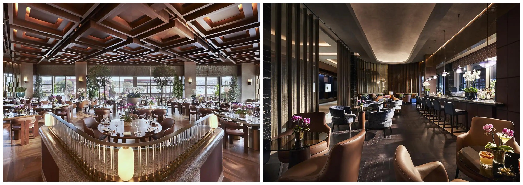 Bên cạnh Novikov Bar – nhà hàng mở cửa cả ngày phục vụ ẩm thực pha trộn giữa phong vị Á, Địa Trung Hải và Ý) – đã đề cập ở trên các điểm ăn uống ven sông bao gồm Olea – nghĩ về món ăn Ý với cách tiếp cận “Cibo di Famiglia” đặc trưng bởi sự ngon tuyệt của món mì tagliatelle với đuôi bò hầm. Nhiều kế hoạch đang được tiến hành cho chuỗi nhà hàng sát biển, hứa hẹn đưa ẩm thực của khách sạn lên tầm cao mới.