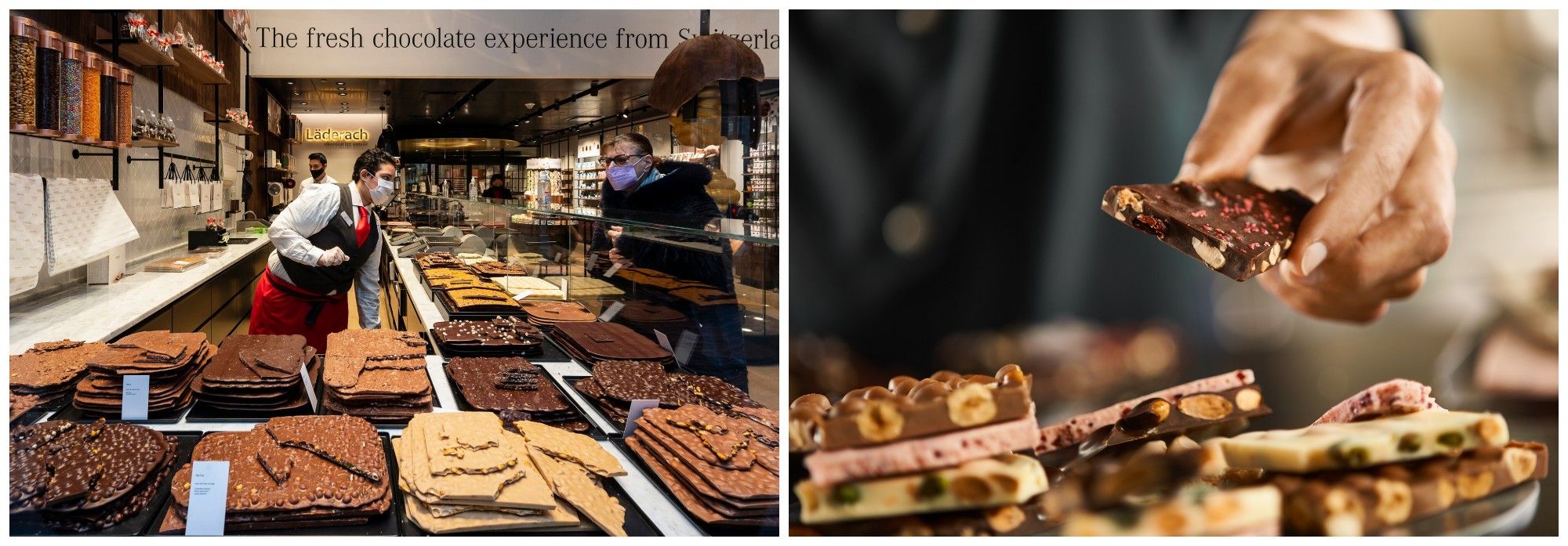 Tại Thụy Sỹ, Läderach được xem như biểu tượng của sự chuẩn mực và chính xác. Thành lập từ năm 1962, thương hiệu này nổi tiếng với phương pháp sản xuất quy mô nhỏ và kiểm soát chặt chẽ từng công đoạn. Chocolate của Läderach chinh phục giới sành ăn bằng kết cấu mượt mà, độ cân bằng tinh tế và cảm giác tan đều trong khoang miệng. Những sáng tạo dành riêng cho thị trường Trung Đông, như thanh chocolate pistachio knafeh, cho thấy khả năng dung hòa giữa di sản Thụy Sỹ và bản sắc địa phương một cách đầy thuyết phục. Trong khi đó, thương hiệu Teuscher mang đến một định nghĩa khác về sự xa xỉ, nơi nguyên liệu tự nhiên đắt giá được kết hợp với kỹ thuật thủ công truyền thống. Những viên champagne truffles trứ danh của Teuscher, với lớp nhân kem champagne mềm mịn, đã trở thành biểu tượng toàn cầu của nghệ thuật thưởng thức tinh tế, được giới phê bình và người sành ăn ca ngợi suốt nhiều thập kỷ.