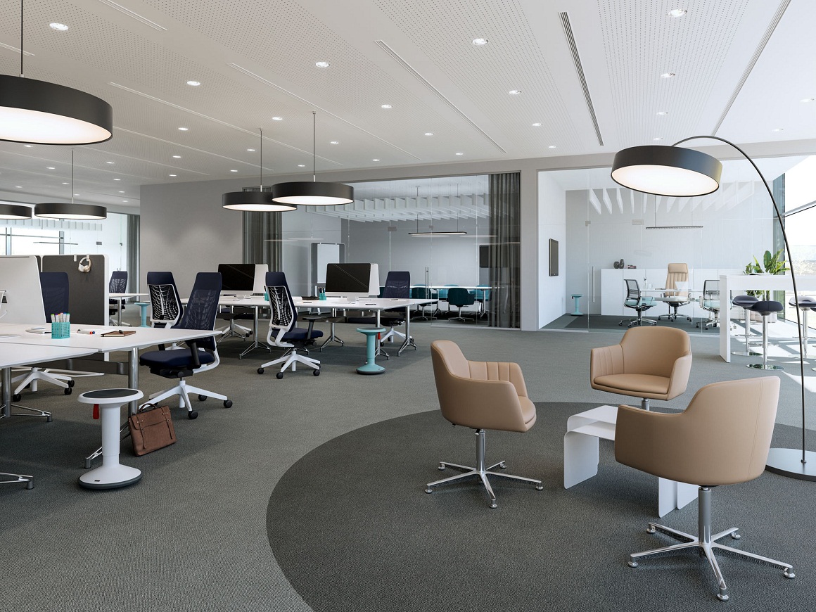 Về phần thiết kế, ngay cả khi sử dụng những món nội thất giống nhau, Interstuhl luôn biến tấu linh hoạt và sáng tạo theo từng môi trường sao cho phù hợp với khách hàng nhất. Nếu như khu vực sinh hoạt chung mang phong cách năng động, đóng vai trò thúc đẩy sự tương tác giữa các nhân viên thì sảnh chờ lại được thiết kế mới mẻ, sáng tạo để truyền cảm hứng. Phòng quản lý thường được sử dụng tông màu trầm và đồ nội thất lớn để tăng vẻ trang trọng, chuyên nghiệp nhưng không hề xa cách. Cuối cùng là không gian thư giãn với lối thiết kế thoáng đãng, mang đến cho nhân viên những giây phút nghỉ ngơi trọn vẹn.