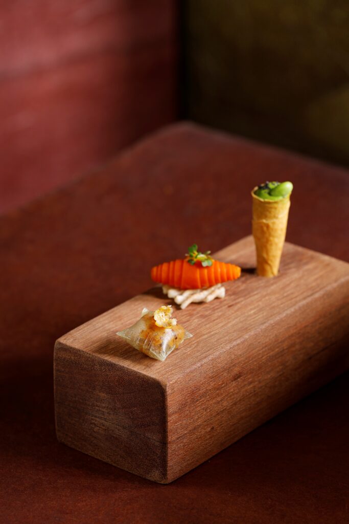 Hành trình mở ra bằng những hương vị tươi sáng: cà rốt hữu cơ Đà Lạt kết hợp cam Cái Bè được ủ giấm tự nhiên cho vị chua ngọt thanh thoát, hay đậu nành tươi Long An đi cùng bánh tráng giòn và hạt kê Sơn La mang đến một khởi đầu đầy bất ngờ. Dưa hấu Tiền Giang và đậu nành An Giang đem lại sắc thái ngọt mát của miền sông nước, trong khi ngó xuân và bạch quả Lào Cai lại khẽ gợi sự tinh khiết của núi cao.