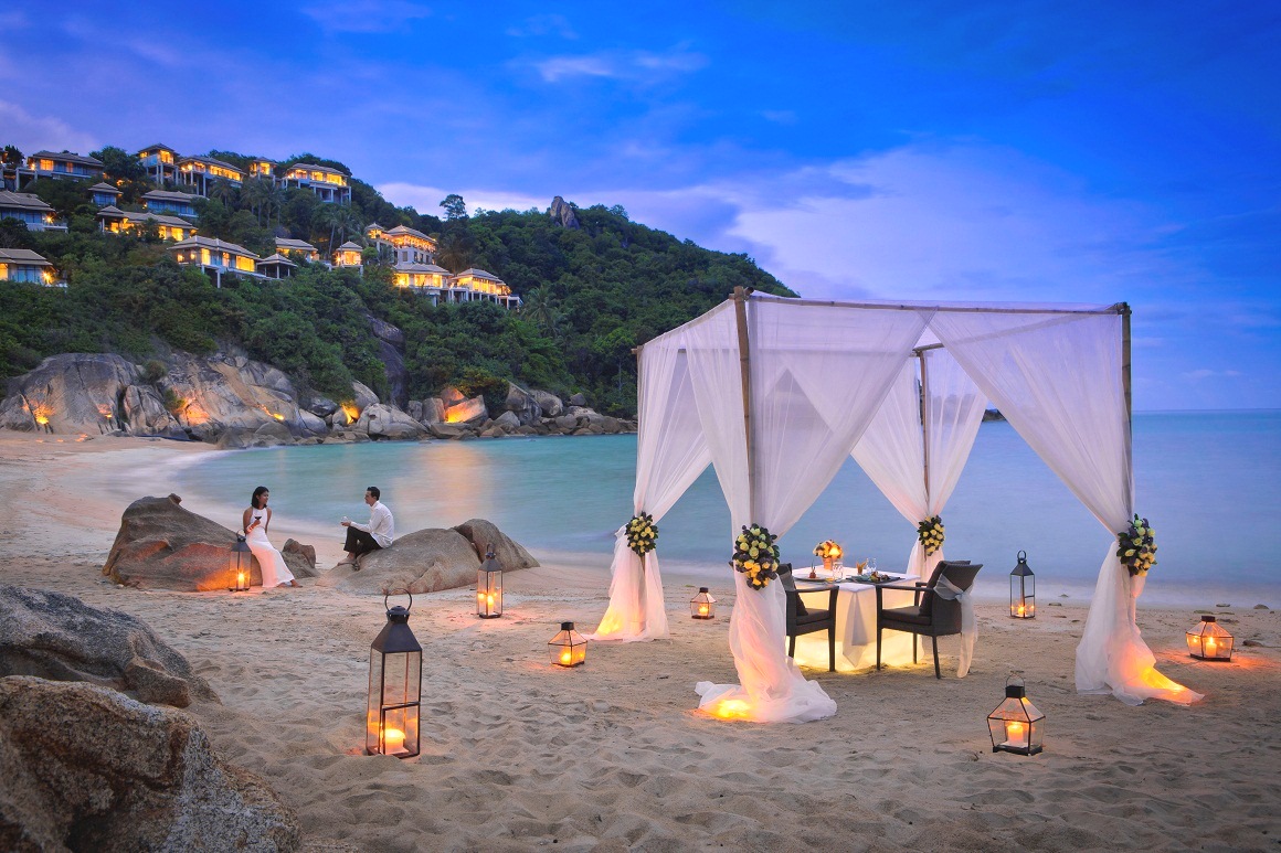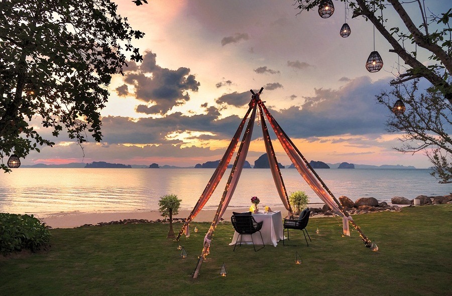 Khu nghỉ dưỡng Banyan Tree Krabi với vị trí yên tĩnh trên bãi biển Tubkaek cũng đã sẵn sàng chào đón các cặp đôi đến trải nghiệm nhân ngày lễ Tình Nhân. Tiệc tối Valentine 3 món sẽ được tổ chức tại bãi cỏ cạnh biển với tầm nhìn ngoạn mục ra những mỏm núi đá vôi nhô lên từ mặt biển của vườn quốc gia Than Bok Khorani. Các cặp đôi sẽ thưởng thức bữa tối lãng mạn dưới những ánh nến lung linh và nền nhạc sống du dương của những bản tình ca serenade. Bữa tối có giá 7.999 THB/hai người, bao gồm set menu 3 món, một chai Bottega Gold Prosecco, và một cành hoa hồng lãng mạn.